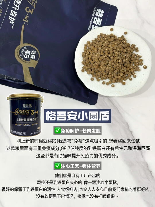 这款烘焙猫粮刚上新的时候就买啦!我是被"免疫"这点吸引的.想着着买回来试试!这款粮里面有三重免疫成分,98.7%纯度的乳铁蛋白还有后生元和深海巨藻,这些都是有助猫咪提升免疫力的优秀成分。他们家是自有工厂产出的颗粒还是乳铁蛋白夹心的,像一颗注心小蛋挞,很好的保留了乳铁蛋白的活性,人食级鲜肉,也令人安心❤目前我们家家猫吃着挺好的。没有软便黑下巴情况,换季也没有打喷嚏啦~吃完继续回购