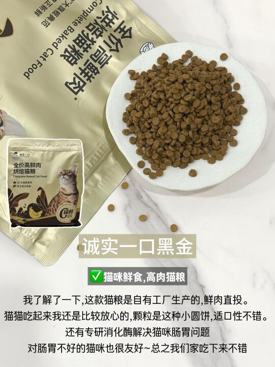 我了解了一下,这款烘焙猫粮是自有工厂生产的,鲜肉直投。猫猫吃起来我还是比较放心的,颗粒是这种小圆饼,适口性不错。还有专研消化酶解决猫咪肠胃问题,对肠胃不好的猫咪也很友好~总之我们家吃下来不错❤