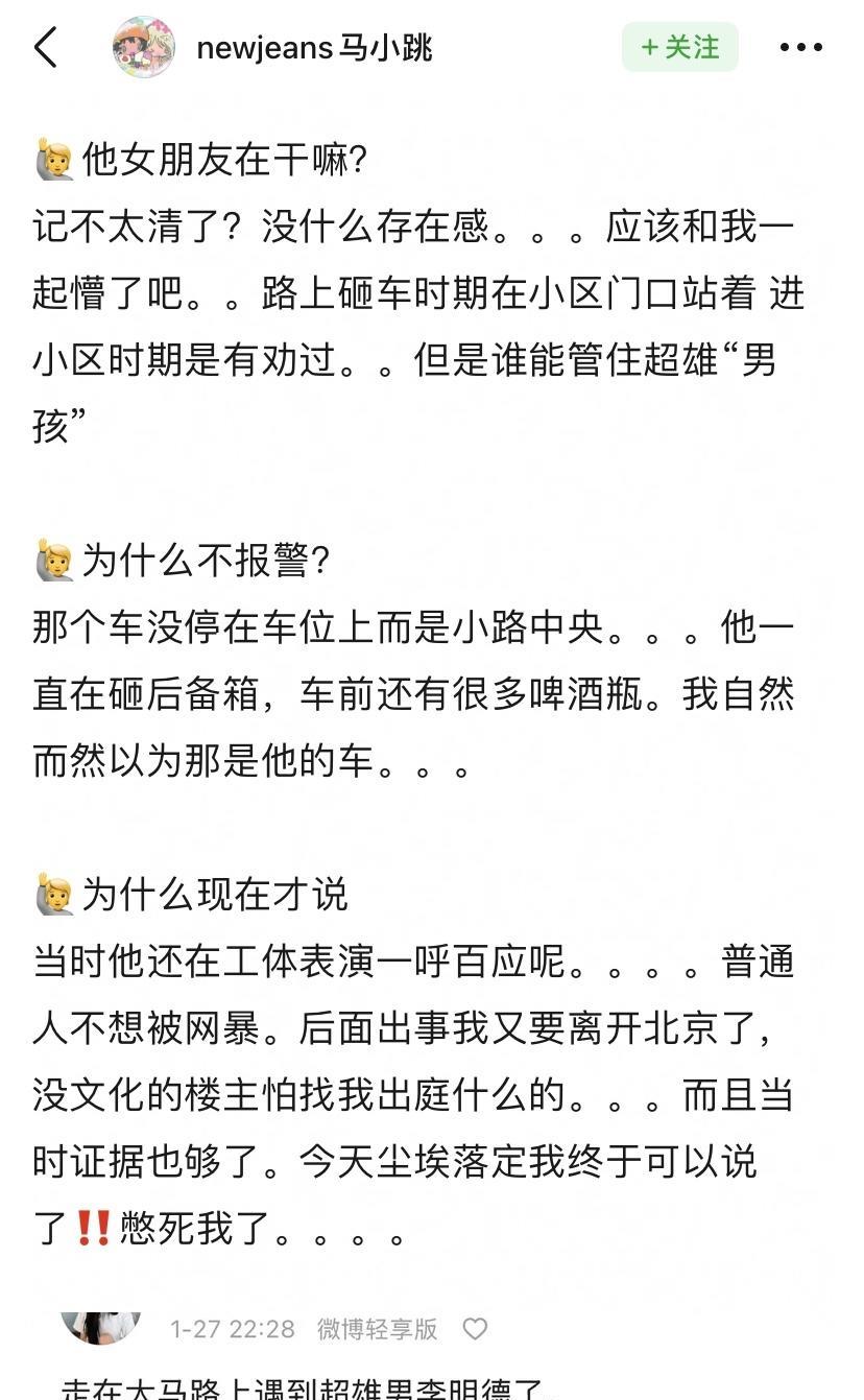 居然有人目睹了李明德砸车全过程。有位网友发帖称自己1月27日晚9点半,在北京一条