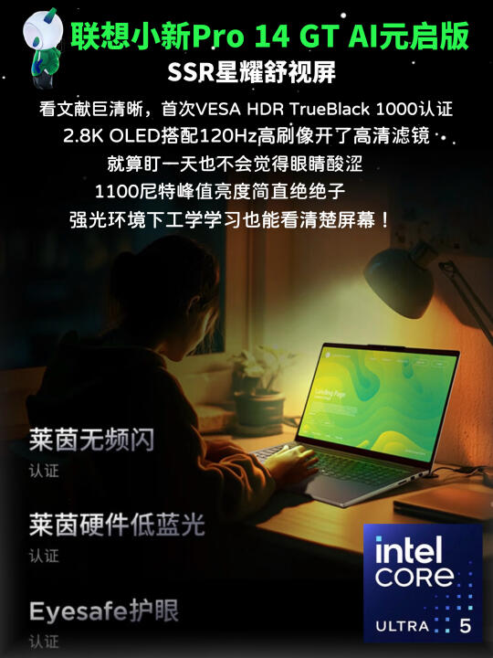 首发VESA HDRTrueBlack1000认证的SSR星耀OLED舒适屏,平时看文档巨清晰,就连打开PS修美照也能把小细节处理的很好~