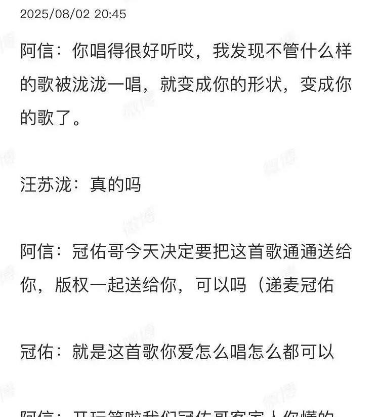 阿信这话听着,真的不是在内涵汪苏泷吗? 汪苏泷去五月天的演唱会当嘉宾,唱完《超人》后,阿信对着汪苏泷说:“你唱得很好听哎,我发现不管什么样的歌被泷泷一唱,就变成你的形状,变成你的歌了~我们冠佑哥就今天决定要把这首歌通通送给你,版权一起送给你,以后你每年收钱。” 况且五月天也经常给别人写歌,把歌曲首唱权交给别人,这次说“变成你的歌了”、“版权一起送给你”,这两句话,难免让人觉得有内涵的意思在里面,不知道是不是我想多了[看]