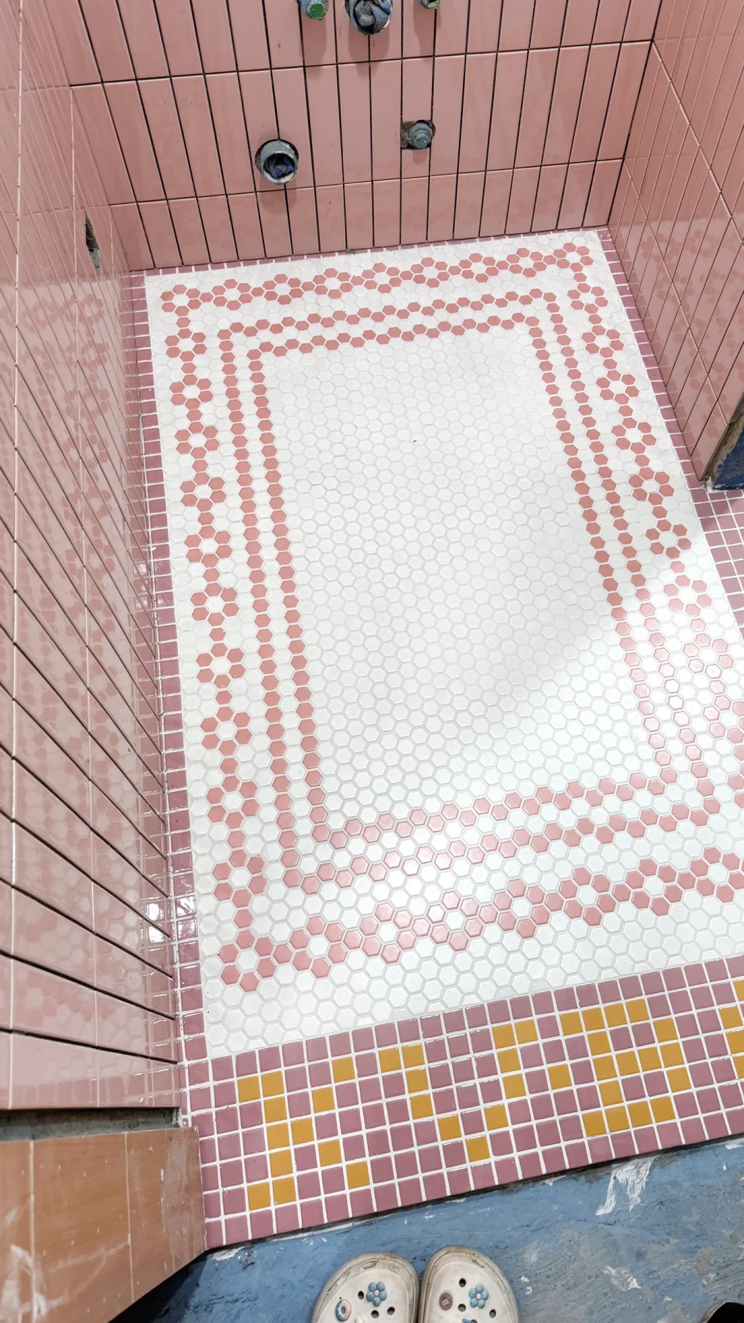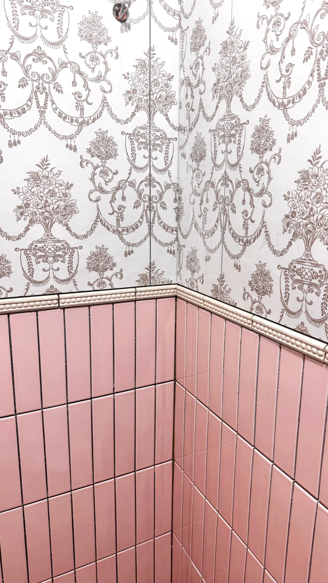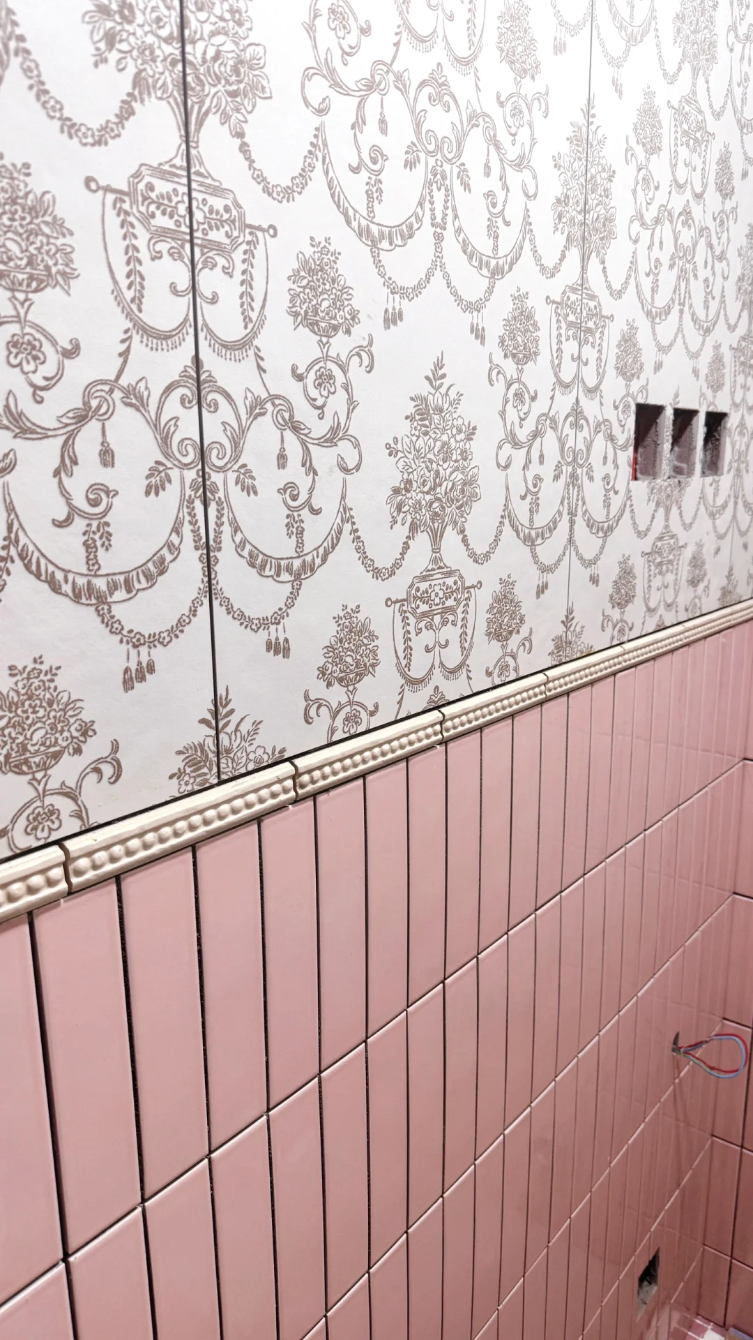 新家是五一节后开工的,本来预计6月初开始贴砖,结果瓦工师傅都准备第二天进场了我们砖还没选好[捂脸R]前期寄了三十多种瓷砖样品到家里,光样品重量加起来都有十几公斤了吧[捂脸R]和设计师现场配色、配型无数次,终于最终定稿,又经历了无货等生产、进口孤品数量不足、工厂尾货整批拿不能按所需数量够买、工厂设计稿与实际尺寸有出入等重重磨难,前后历时近两个月,终于——洗漱间干区铺贴完成啦!看到成品的那一刻真的感动到眼泪掉下来,仿佛看到自己亲手带大的宝宝终于一朝长大的满足感🥺干区的主题是粉色古典洛可可,由上至下分别选择了宫廷感大砖➕意大利进口手工珍珠腰线➕浅粉色长条复古砖➕马赛克定制图案地砖,那段时间的脑细胞基本全用来想它的搭配了[失望R]