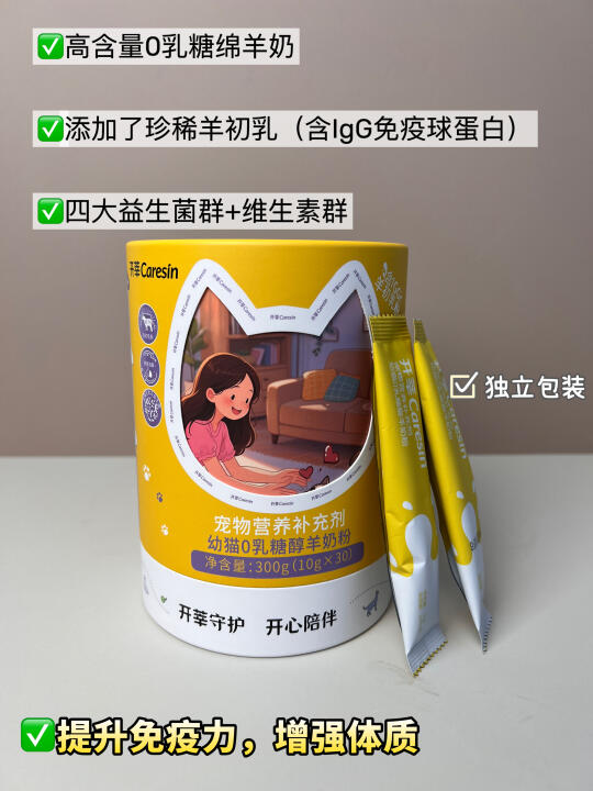 ✅ 更重要的是,营养得跟上! 光吃主粮感觉不够,我就把之前囤的开莘0乳糖羊奶粉翻出来,每天给它冲一小碗(温水冲开晾凉,崽超爱喝🍼)。看中它里面有羊初乳粉(含IGG)和专利益生菌,说是能帮小猫咪增强保护力,调理小肚肚。肠胃好了,营养吸收才到位嘛!