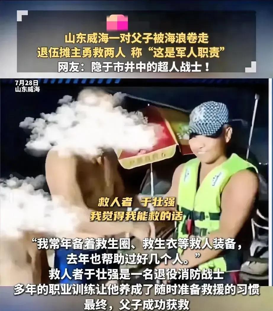 “我觉得能救,这是当兵的本分。”这时天色已黑,在大家恐惧无助时,消防兵于壮强带着探照灯和救生衣救了被海浪裹挟的父子两人。 我们为于壮强点个大大的赞。 这就是“咱们当兵的人”,困难时刻,还是靠有良好素质的有能力的军人的挺身而出。中国军人就是不一般,他们不愧是人民的子弟兵。 我们去海边玩,一定要要带上救生游泳圈。水到大腿根处,就不要再往里走了。退潮时,海水有吸引力,裹挟你往海里走,对一般人来说还是很危险的。 我们去海边旅游玩耍的人们,是否也应注意和管教自己的孩子,注意自身的安全呢!