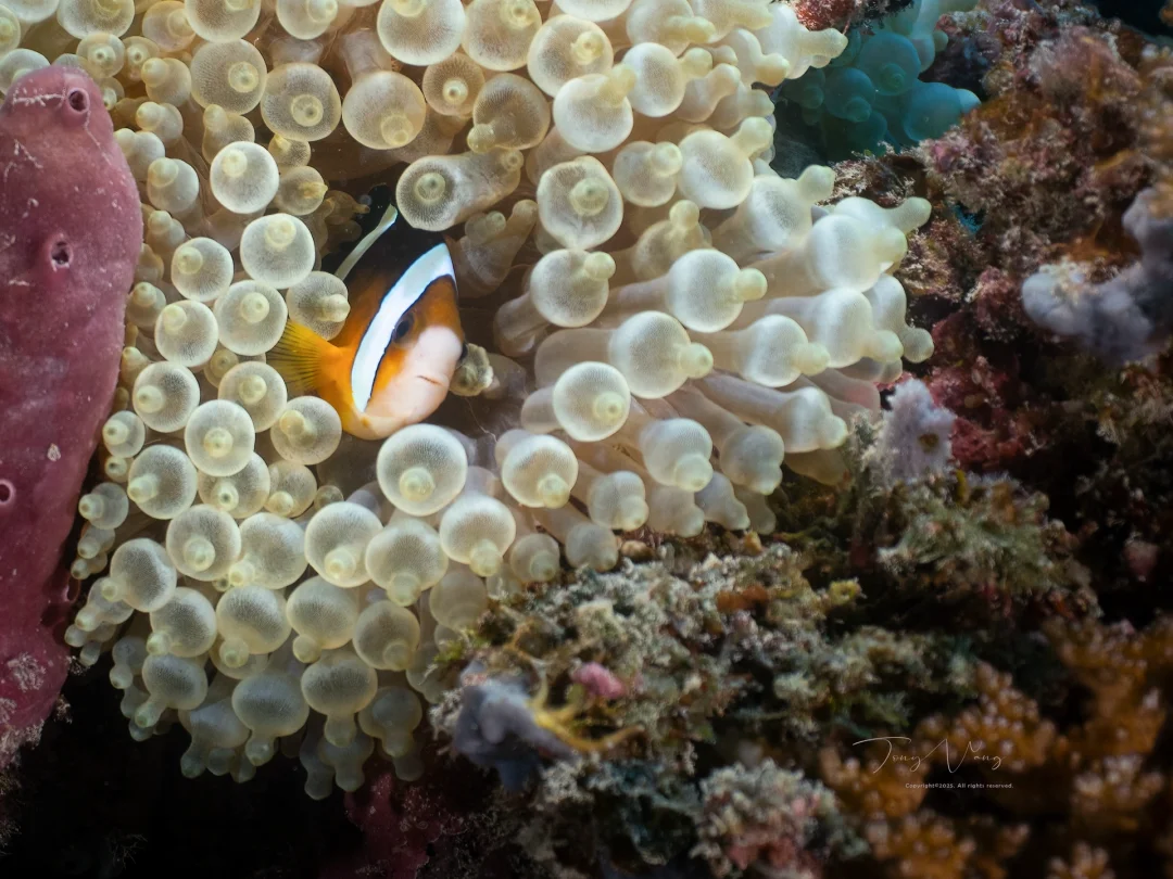 俗称的双带小丑,有着橙黑相间的条纹和灵动的泳姿,我国福建以南就有分布,在广东和海南的珊瑚礁都有机会遇见它们。在仙本那,克氏双锯鱼也是最常见、胆子最大的小丑鱼。在图中的樱蕾篷锥海葵和各种双辐海葵列指海葵中都能找到它们。