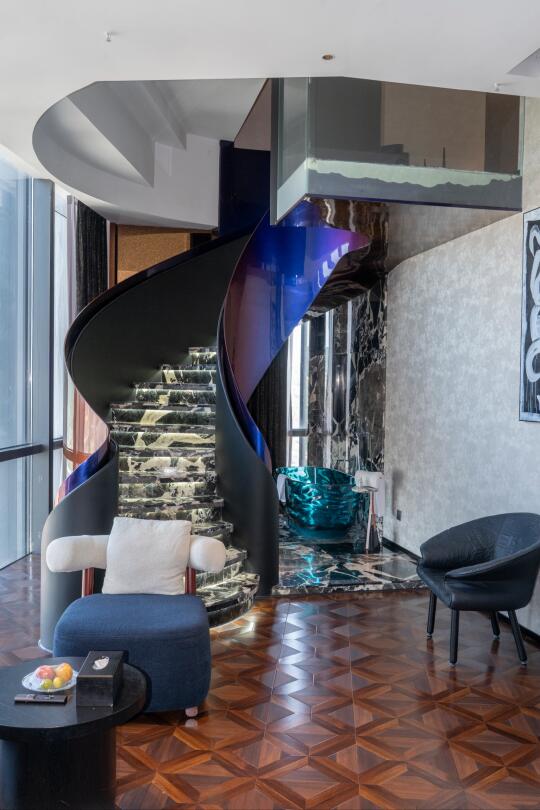 一进房间直接被惊艳到!他们家的loft套房也太戳我了吧~ 黑白为主的装修基调,搭配宝格丽风格的软装细节,黄铜元素点缀其间,随手一拍都是大片感,高级得恰到好处,完全长在我的审美点上!就连旋转楼梯都是感应灯💡,既出片又贴心!