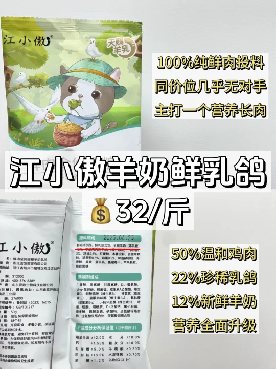 这款主要是看中了它的进阶营养配方。50%的鲜鸡肉提供了猫咪所需基础营养,22%鲜乳鸽可以给猫咪补充天然赖氨酸、牛磺酸,ps这些都是乳鸽独有的营养,很打动我。12%鲜羊奶还是A2型的,7倍opo乳源,能提高猫猫免疫力[点赞R]
