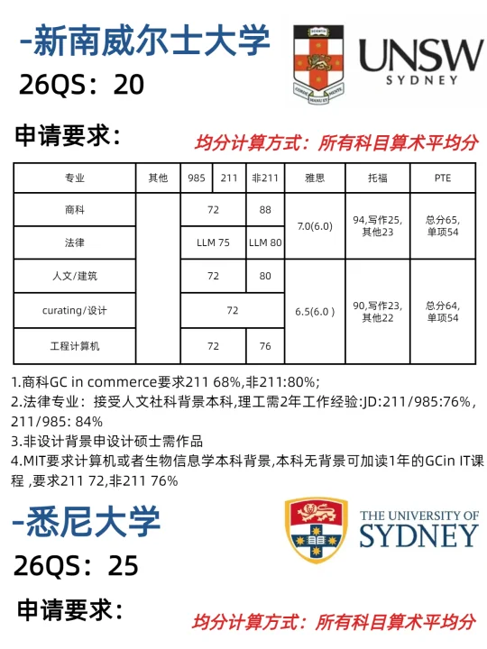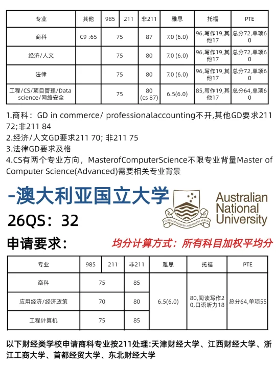均分按算术平均算!商科:211/985需72,非211需88;设计类要作品集,MIT需计算机背景;GC桥梁项目门槛低(211 68%起),适合均分擦线党。