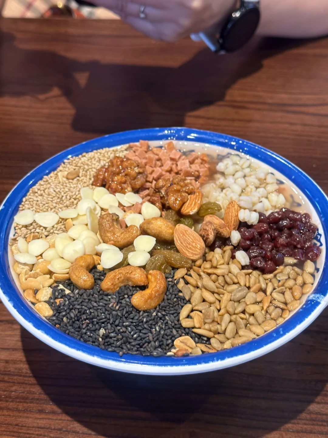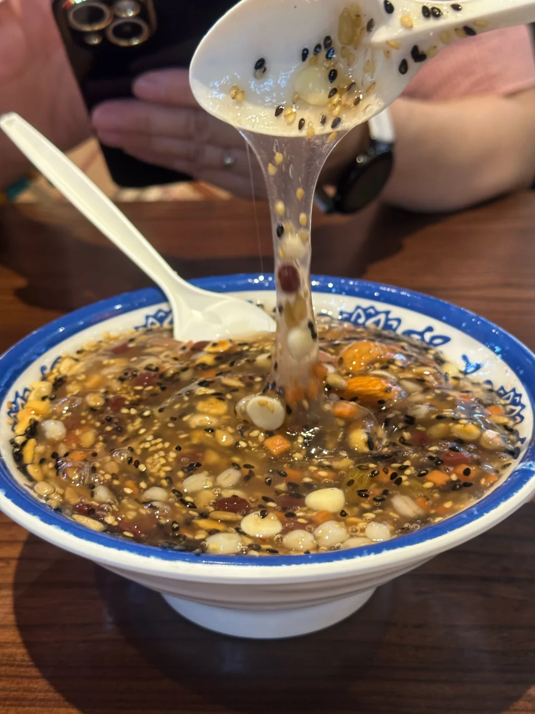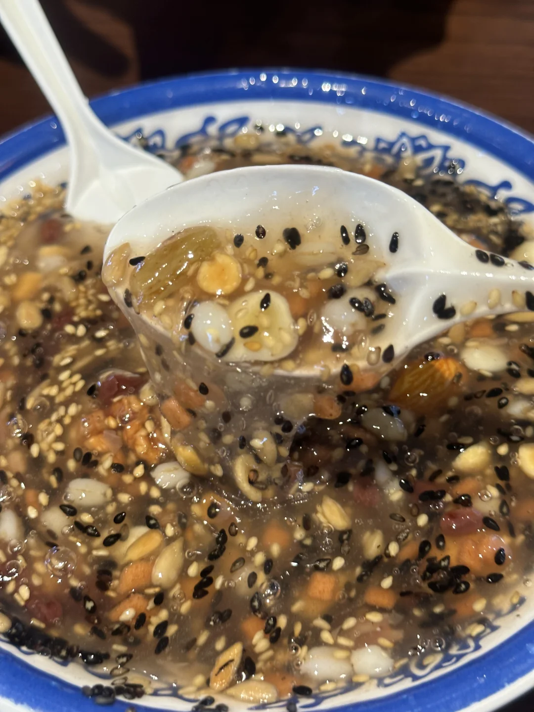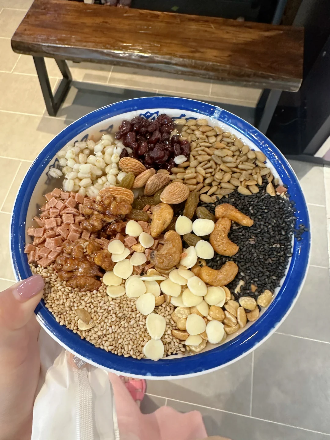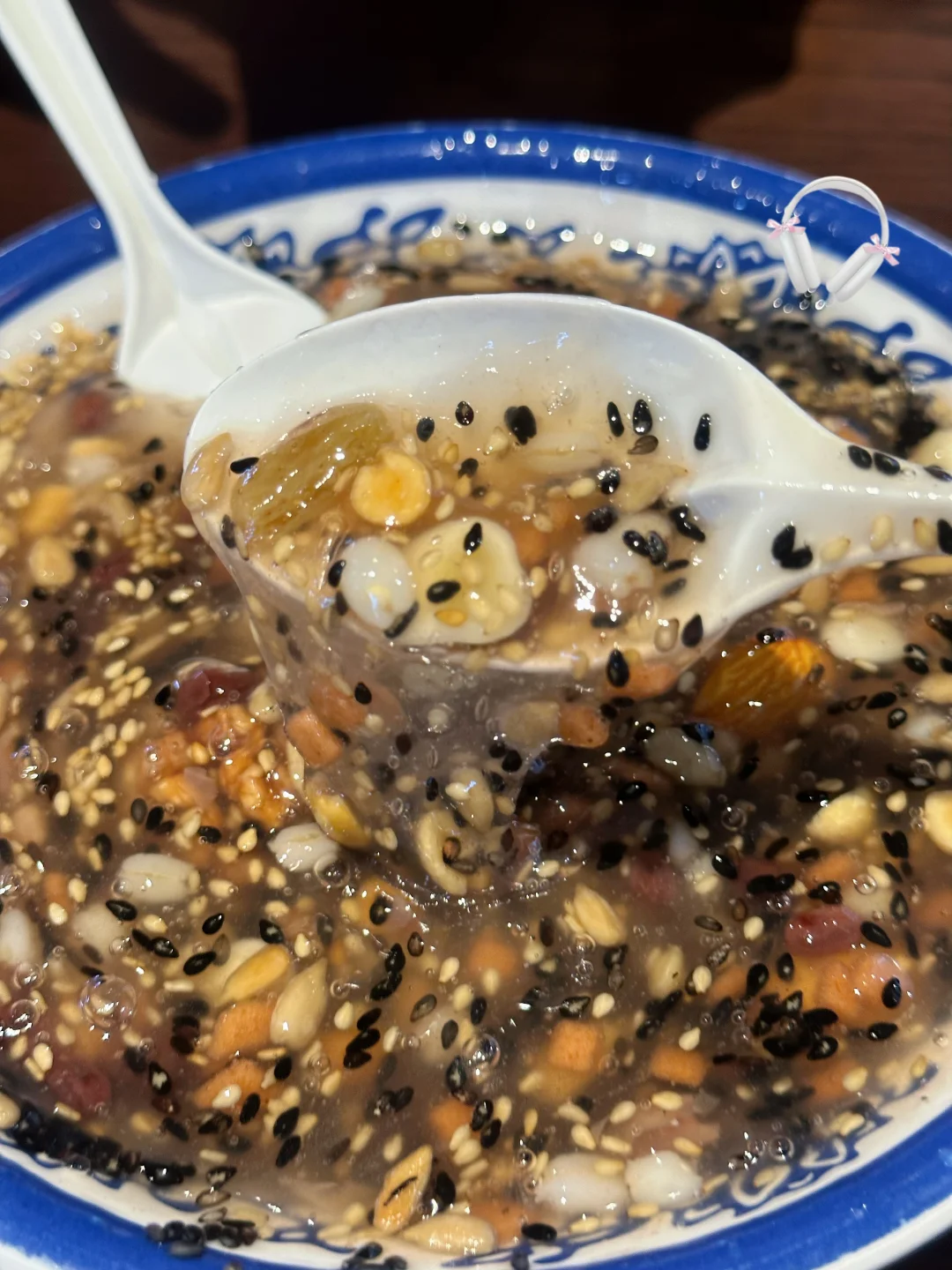 来胖东来只为吃这一碗杏仁茶!十几种料,满满一碗馋哭隔壁小孩儿[黄金薯R][黄金薯R][黄金薯R][皱眉R][皱眉R][皱眉R] 建议堂食哈~ 藕粉淡淡清香,所有小料搅拌在一起,里面有山楂的酸甜、坚果香、杏仁香、芝麻香…完全不腻 热乎乎一碗舒服👍