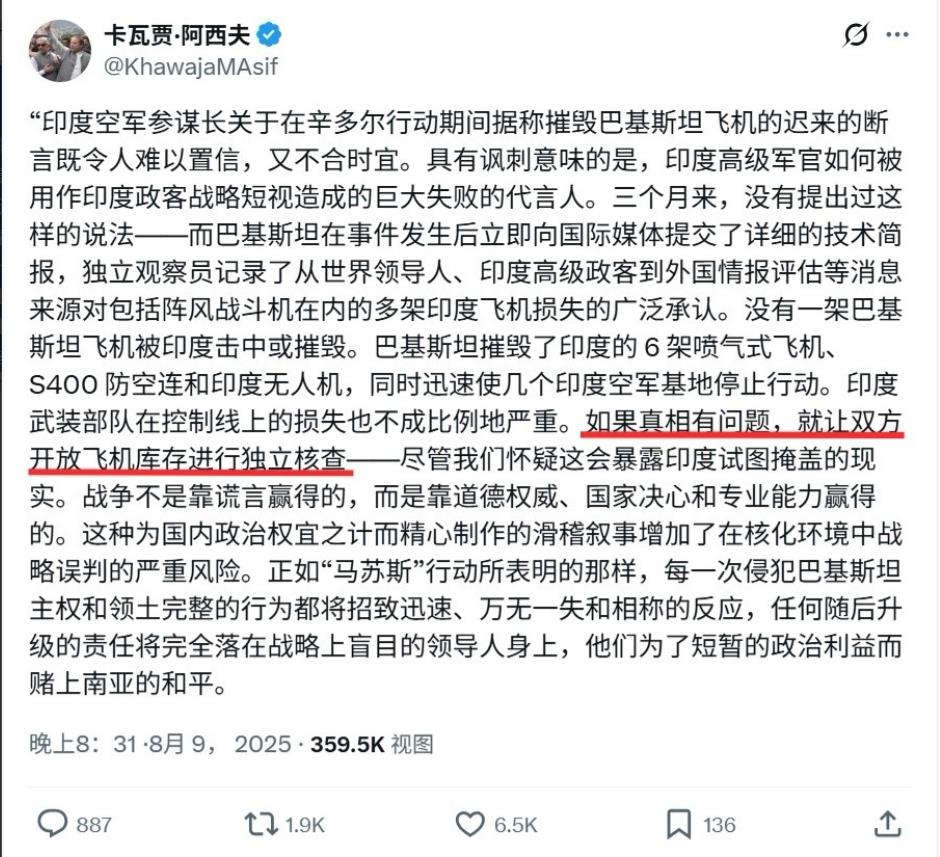 印度空军参谋长还在嘴硬,说5.7空战打下6架巴军战机,不料巴基斯坦防长一句“敢开机库验货吗?”,直接把印度军方给干沉默了! 这几天,印度空军参谋长阿马尔·普里特·辛格在掌声雷动中捧出了一则“史诗捷报”——时隔三月,他们宣称击落巴方6架军机,其中甚至还包括一架预警机,可以说堪称南亚魔幻现实主义的巅峰之作。 而不久之后,巴基斯坦防长阿西夫一句“敢开机库验货吗?”的提议,瞬间戳破了这出精心编排的闹剧。 毕竟,法国达索公司早已默默核销了一架印度“阵风”的数据,五角大楼也直言“未见巴军F-16损伤痕迹”,这些来自第三方的数据,可比印军的卫星P图诚实百倍。 至于印军库存?除非他现在火速去找法国达索要到至少3架阵风,并用最快的速度换上印度涂装,否则印军肯定没有那个胆量回应巴基斯坦方面的建议。 这场“迟来战报”的精妙,恰在于它用民族主义的咖喱浓汤,将阵风神话破灭的苦涩熬煮成精神胜利的迷幻药——国内军官鼓掌、政客欢呼,国际社会却忙着在“40年搞不明白一架LCA”和“把金星当成不明飞行物”的调侃中,为印度军工喜剧再添新梗。 事实上,当印度人忙着用虚构战绩对冲特朗普50%关税的重拳时,唯一真实的,或许是洪水滔天的杰纳布河下游——那里被印度人泄洪淹没的巴铁村庄,倒是不用卫星图也能核查的“战果”。
