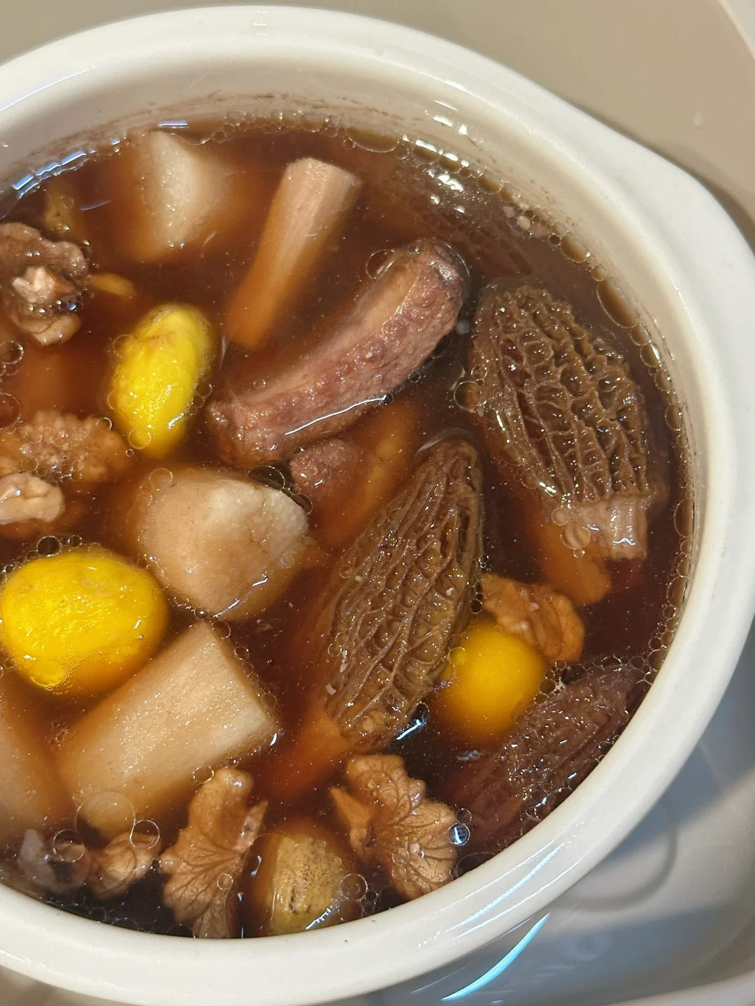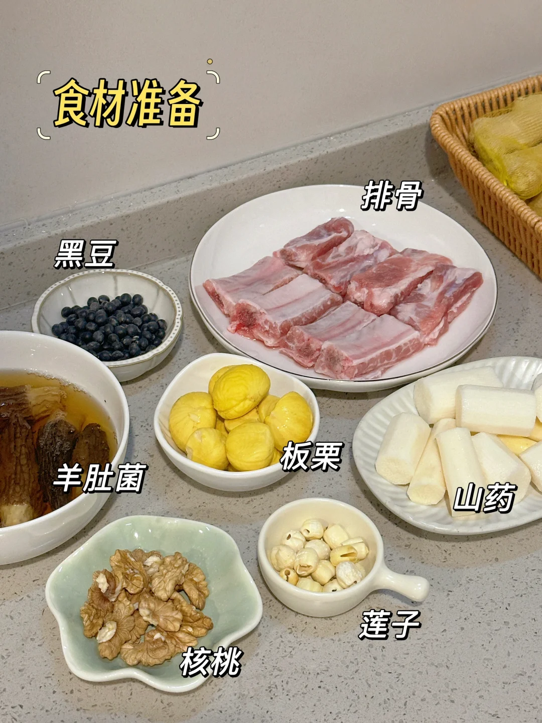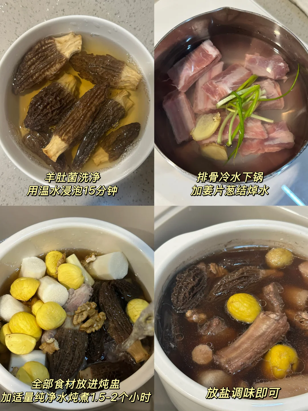 👉🏻准备排骨,核桃,黑豆,板栗,山药,莲子,羊肚菌,羊肚菌洗净用温水浸泡15分钟,待会把浸泡的水也一起加进炖盅,排骨加姜片,葱结焯水,其他食材处理好,然后加进炖盅,放适量水,一键炖汤模式,出锅放盐调味就可以啦~~