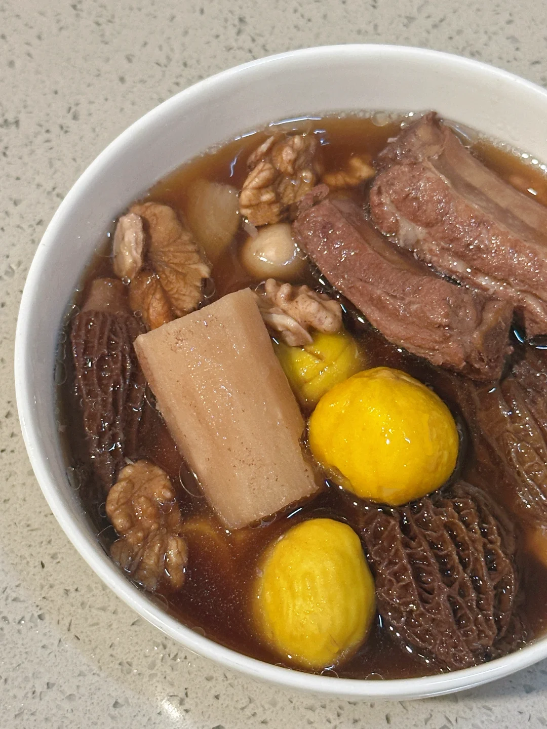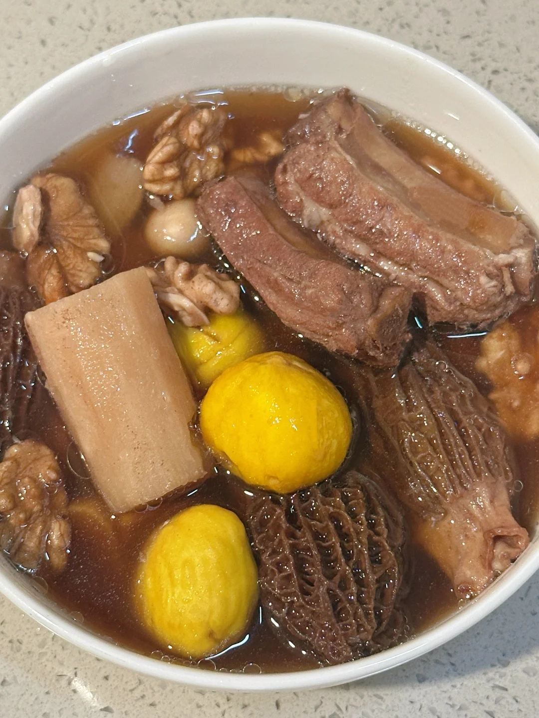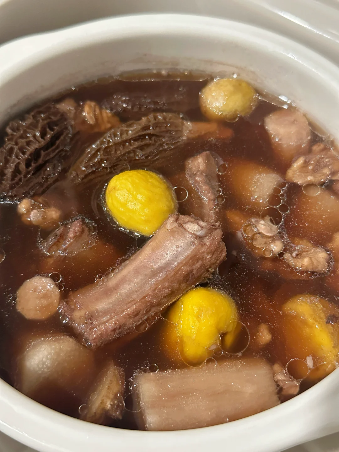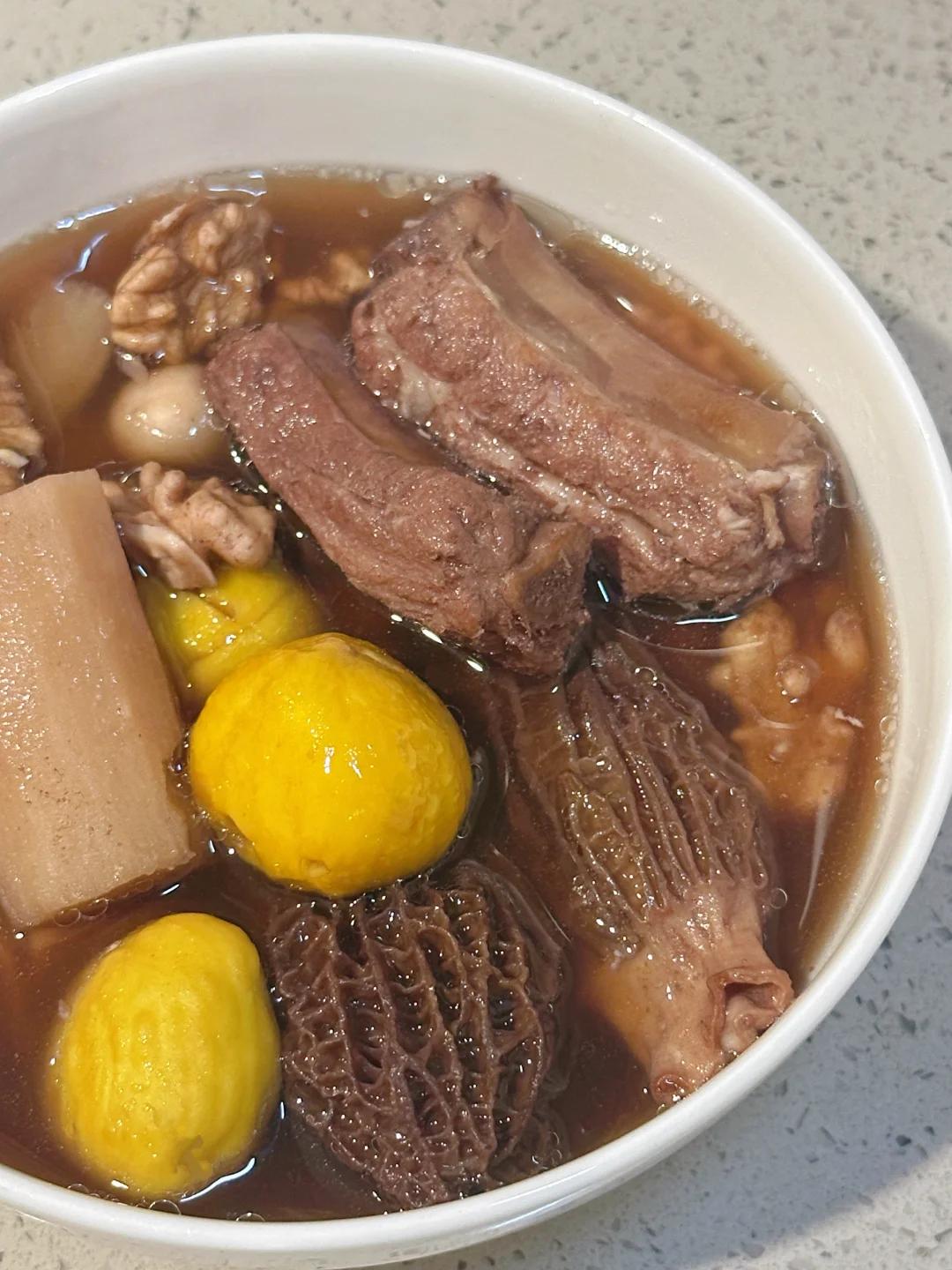 👉🏻准备排骨,核桃,黑豆,板栗,山药,莲子,羊肚菌,羊肚菌洗净用温水浸泡15分钟,待会把浸泡的水也一起加进炖盅,排骨加姜片,葱结焯水,其他食材处理好,然后加进炖盅,放适量水,一键炖汤模式,出锅放盐调味就可以啦~~