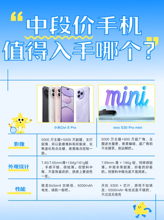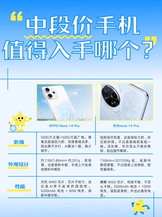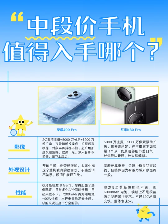 谁懂我每次出去玩,打扮美美的,结果男朋友拍不出好图的痛啊。后面才知道让男朋友背锅了,原来是设备没用好。今天给大家对比一下当前很火热的六款3000-5000左右的手机,看看你更适合哪款。 📸 荣耀400 Pro 2亿超清主摄+5000 万长焦+1200 万超广角,夜景暗部没噪点,拍摄起来很稳,对象手再抖都不怕。超广角拍建筑很震撼,效果一绝。多人合影不畸变,细节上给足。 整体手感上也蛮舒服的,金属中框这个结构我真的很喜欢,手感丝滑不坠手,颜值性能双在线。 而且芯片是骁龙 8 Gen3,撑得起整个影像配置,日常多个APP同时使用,用起来也不卡。7200mAh 青海湖电池+90W快充,出行电量给足安全感,总的来说还是十分全能的。 📸 红米K80 Pro 5000万主摄+5000万像素浮动长焦,像素堆料足,但主摄底不如荣耀1/1.9,夜景暗部细节差口气。 拿着要厚重些,金属中框是我喜欢的,但整体因为有重力感所以显得一般。 骁龙8至尊版性能也不错,但6000mAh电池,续航上不是很能满足我的出行要求。不过120W 快充快,整体表现ok。 📸 小米Civi 5 Pro 5000万主摄+5000万副摄,主打轻薄,所以影像堆料有所衰减,长焦虚化有点生硬,夜景噪点控制一般。 7.45/7.65mm薄+184g/181g轻,手感不错,很轻薄。但塑料中框,不是我喜欢的,质感上要逊色一些。 骁龙 8s Gen4 功耗低,6000mAh 电池,续航一般吧。 📸 vivo S30 Pro mini 5000万主摄+800万超广角,主摄进光量差,夜景偏暗,超广角拍不全建筑。 天玑9300+芯片,游戏不如骁龙;6500mAh电池还是不错的,但没无线充。 📸 OPPO Reno 14 Pro 5000万主摄+5000万超广角。像素还是蛮给力的,但夜景噪点多,拍远像不太行,AI算法一般,缺少细节。 约7.58/7.48mm+约201g,很轻薄,也是塑料中框,手感上不如其他塑料中框机。 6200mAh 电池+80W 快充,续航中规中矩。 📸 华为 nova14 Pro 5000万主摄 + 800万超广角 + 150万多光谱通道红枫原色镜头。拍照消灭色差,所见即所得。没长焦,华为怎么不做长焦呀。 7.68mm+207/204g,金属中框但厚重,不过质感上没得挑,配色偏商务。 麒麟8020芯片,性能不错,不怎么卡顿。 整体看下来,我更青睐荣耀400 Pro,比较全能,治好手残党的同时,日常使用性价比也很高。 荣耀400 荣耀 华为nova14Pro OPPOReno14Pro vivoS30Pro mini