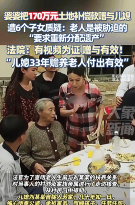 “脸都不要了?”吉林,一年迈老人录下视频,宣布把170万遗产全部留给伺候她33年的小儿媳。岂料,其他六个子女突然跳出来,硬说老母亲是被逼的,非要抢钱重分,还闹了好几次!小儿媳是既生气又委屈,被逼无奈,只能把他们全部告上法庭。全村都知道小儿媳几十年如一日照顾老人,是出了名的孝顺!最后法院的判决让网友们直呼“判的好!” 王老太。她身患重病,行动不便,长期瘫痪在床。她有七个子女,但在她最需要帮助的时候,真正对她不离不弃、悉心照料的,只有她的小儿媳刘女士。 多年前,那时,王老太已经年迈,身体日渐衰弱。 一次严重的疾病袭来,老人急需医药费和治疗,但家中经济拮据,且王老太的几个儿女各自有家庭,平时忙于各自生活,对老母亲的照顾极为有限。 尤其是在王老太瘫痪后,其他六个子女对她的态度发生了明显变化,纷纷躲避,甚至冷漠无情。 唯一留下来,日夜陪伴,帮她擦洗身体、换药、喂饭的,正是那个小儿媳刘女士。刘女士嫁入王家已经33年,跟着丈夫经历过风风雨雨,对婆婆更是有着深厚的感情。 老人瘫痪后,刘女士几乎承担了所有的护理工作,无怨无悔,二十四小时轮流守护,悉心照料。 当时,王老太的病情加重,需要住院治疗,可其他六个子女却一再推脱,声称家里经济拮据,孩子还小,治病费难以承担,甚至劝老人放弃治疗。 面对如此情况,刘女士坚定地站了出来,她对婆婆说:“妈,这病咱得治,不管多难,我都会尽全力照顾您。” 她一边四处筹钱,一边自己省吃俭用,只为让婆婆能得到最好的治疗。 正是在刘女士的坚持和付出下,王老太的病情得到了控制。时间流逝,村里迎来了一次土地征收补偿。 由于村里土地被政府征用,王老太一家获得了170万元的征收补偿款。原本,老人和家人都以为这笔钱会被平分,毕竟每个儿女都有份。 令所有人意想不到的是,王老太临终前录制了一段视频,在视频中,她明确宣布,将这笔170万元的补偿款全部留给一直照顾她、孝顺她、陪伴她33年的小儿媳刘女士。 她说:“刘女士这么多年对我好,其他子女没一个像她这样尽心尽力,我把这笔钱都留给她,作为对她的感谢。” 这段视频很快在村里传开了。其他六个子女看到视频后,起初惊愕不已,随后愤怒起来。 他们质疑母亲的决定,声称老人一定是被小儿媳逼迫才做出这样的安排。他们纷纷上门找刘女士“理论”,声称这笔钱应该重新分配,要求分割财产。 在接下来几个月里,六个子女多次到刘女士家中闹事,甚至大声辱骂、威胁。面对突如其来的家庭纷争,刘女士既生气又委屈。 她没有反驳,也没有退缩,而是选择通过法律途径维护自己的合法权益。 全村的人都清楚,刘女士这些年对王老太的付出是有目共睹的。她不但无怨无悔地承担了繁重的护理工作,还在经济上帮助家庭渡过难关。 村里老人和邻居们纷纷站出来作证,称刘女士是出了名的孝顺。 案件进入法院审理阶段。法院详细调查了事实,对王老太录制的视频和赠与意愿进行了全面核实。 法院认为,王老太作为成年人,在清醒状态下作出的赠与决定,应受到法律保护。小儿媳刘女士取得上述财产既未违反法律、行政法规的强制性规定,也未违反公序良俗。 最终,法院判决:王老太将补偿款赠与给刘女士的行为合法有效,其他子女无权要求重新分配该财产。 判决结果一出,村里人纷纷称赞法院判得公正,“判的好!”不少网友也在网络上表达了支持,认为真正孝顺老人、无私付出的人,理应得到应有的尊重和回报。