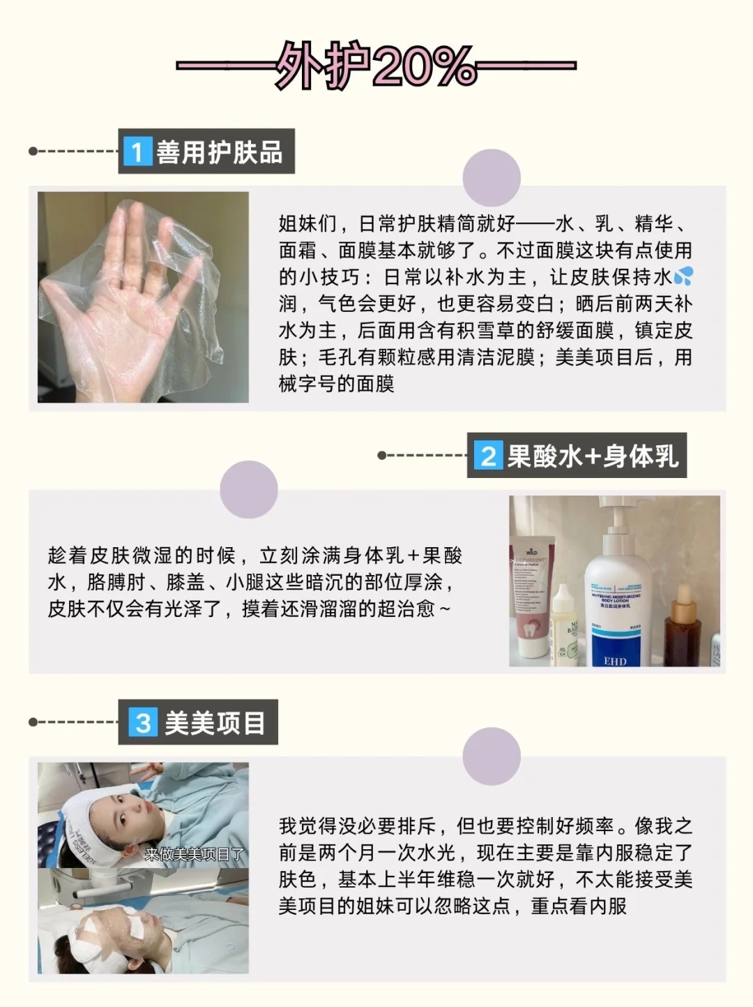 该说不说,每次发照片被宝子们夸的时候就感觉这钱还是花的还是很值的,下面就和大家分享下我变白的小秘诀,想白的姐妹可以直接参考👇🏻