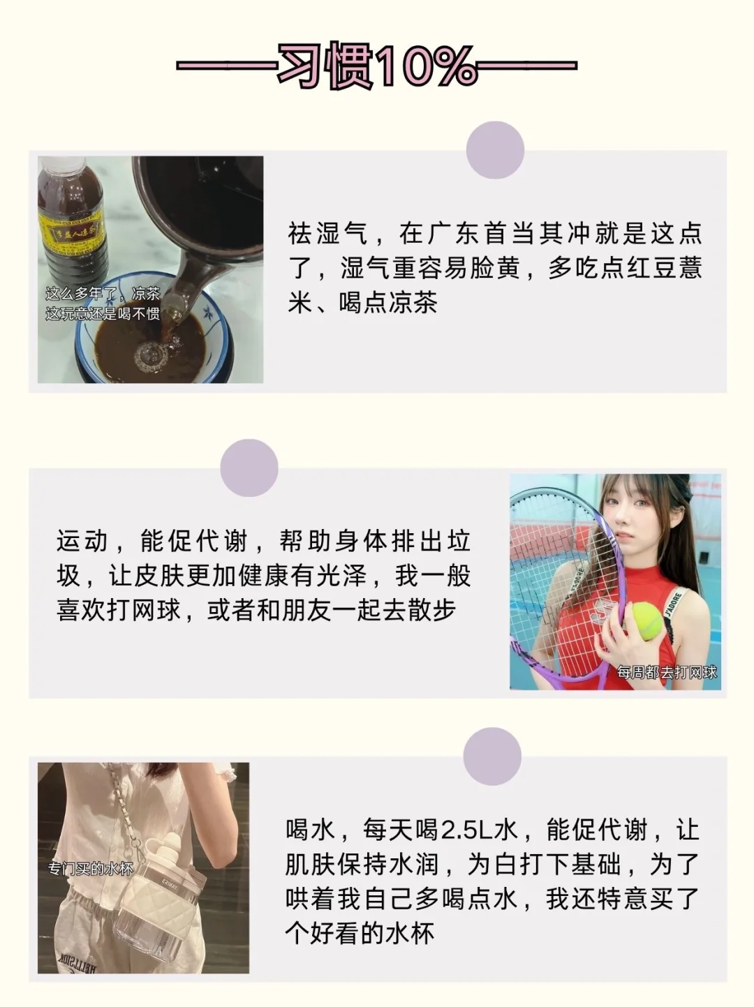 ✔喝水,每天喝2.5L水,能促代谢,让肌肤保持水润,为白打下基础