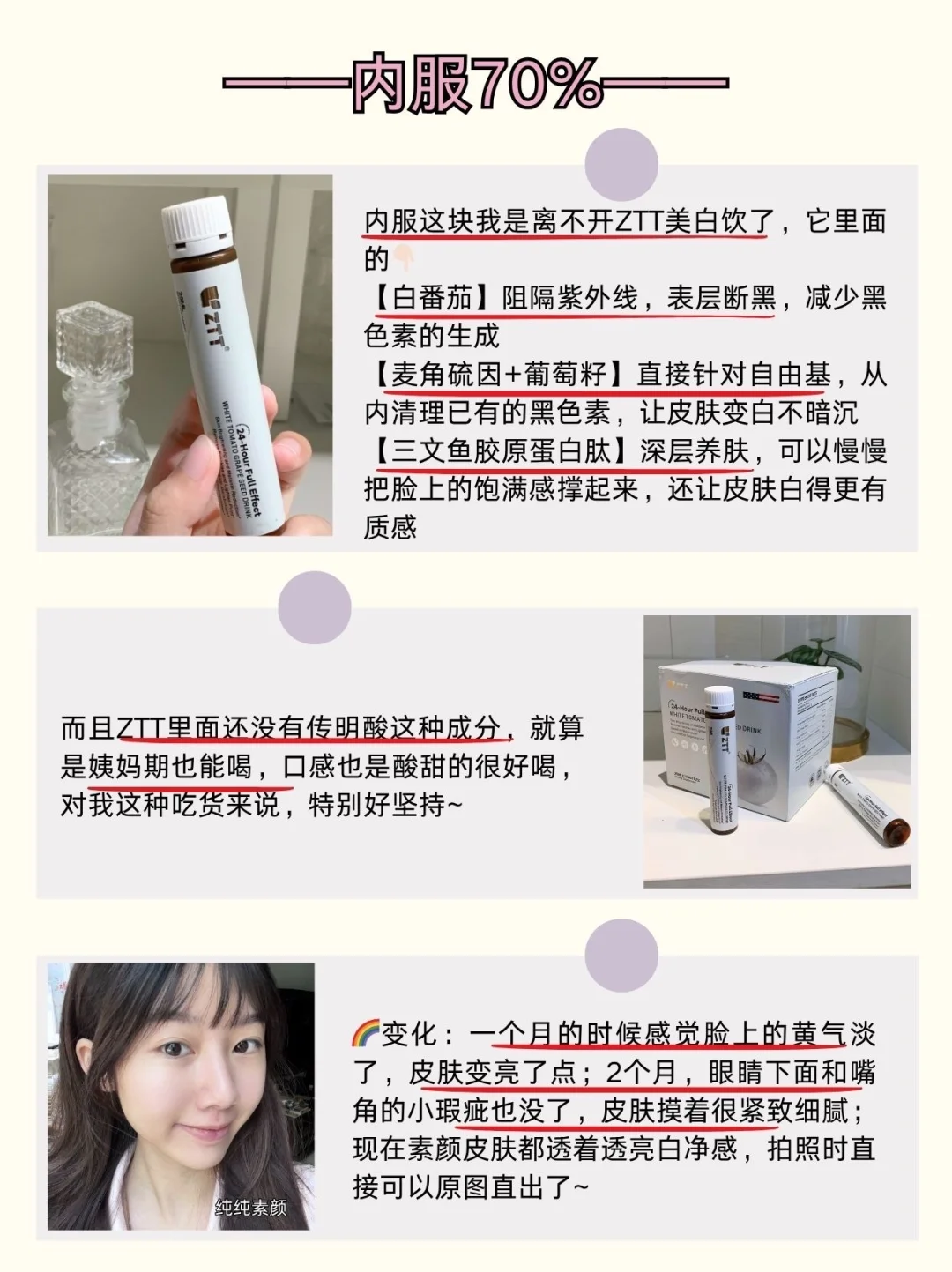 外护只能起到作用是有限的,想要去掉皮肤的色沉和暗黄,还得看内服,在这块我是离不开ZTT美白饮了,它里面的👇🏻