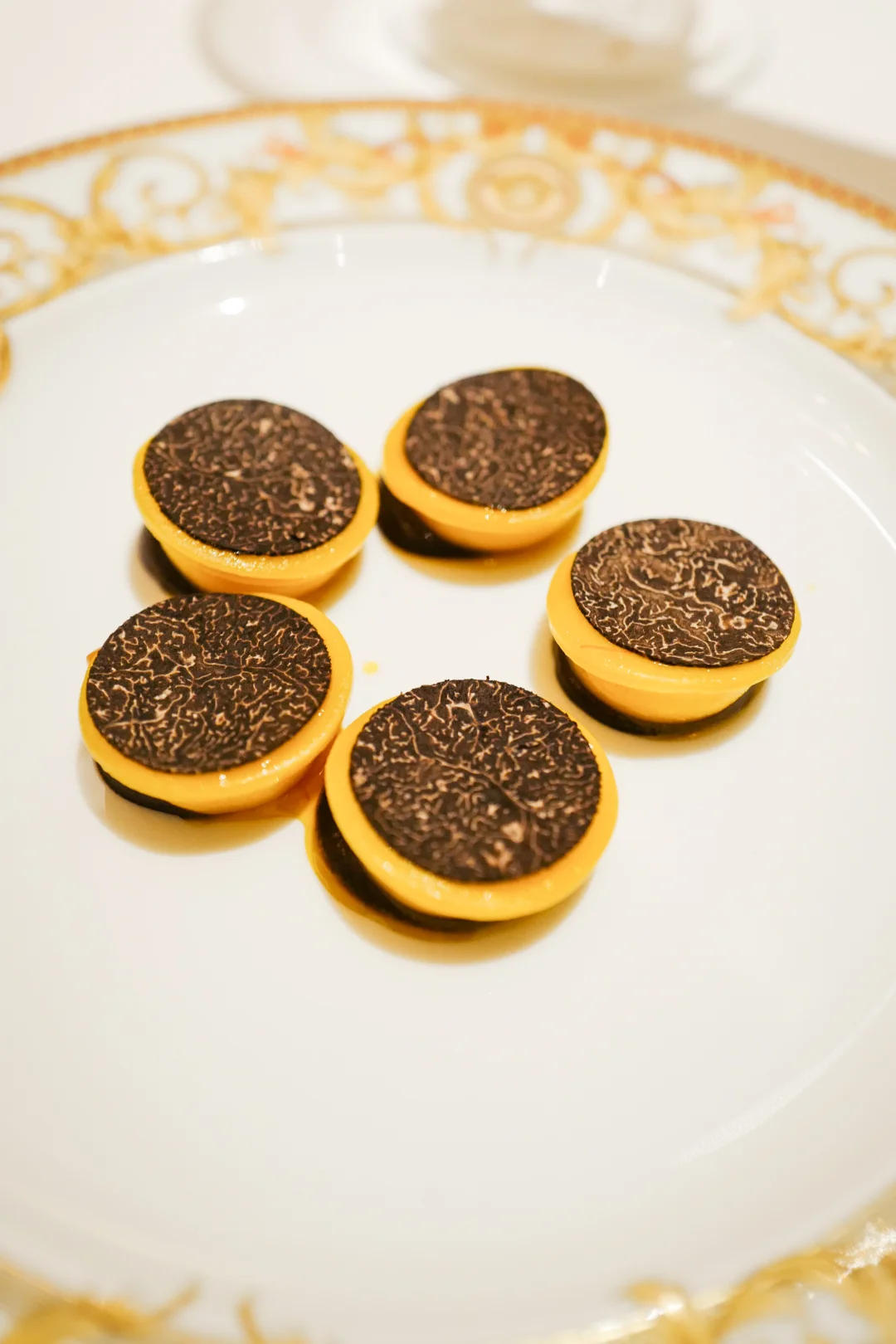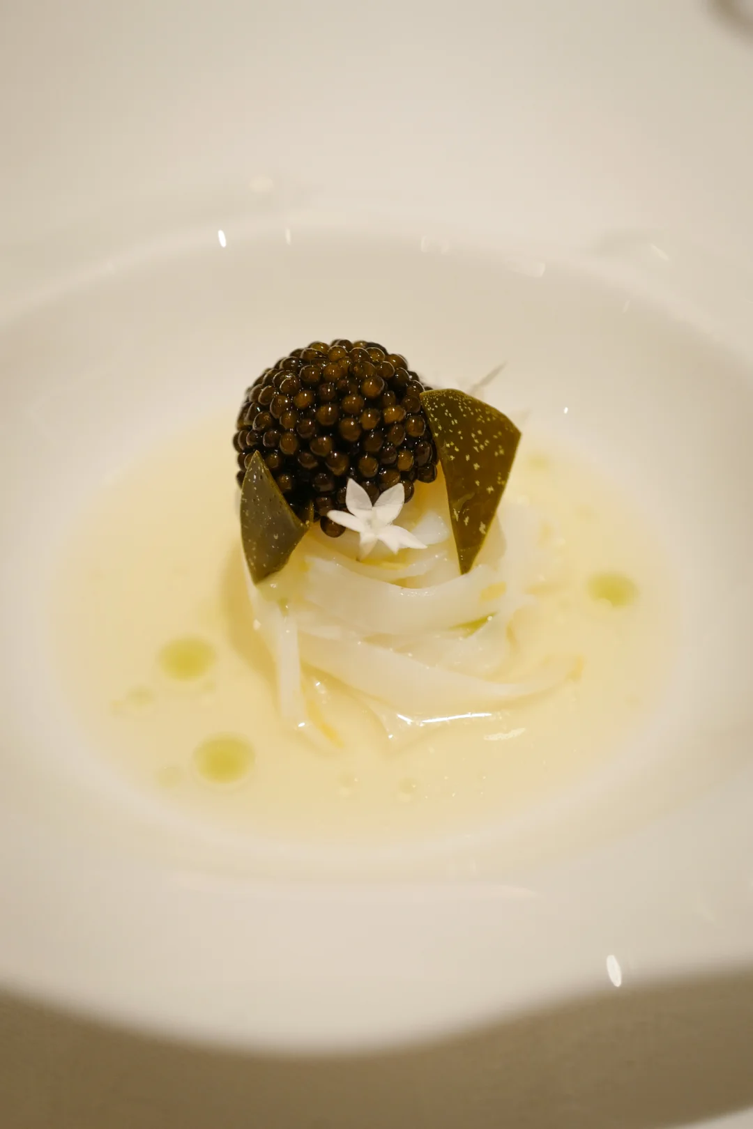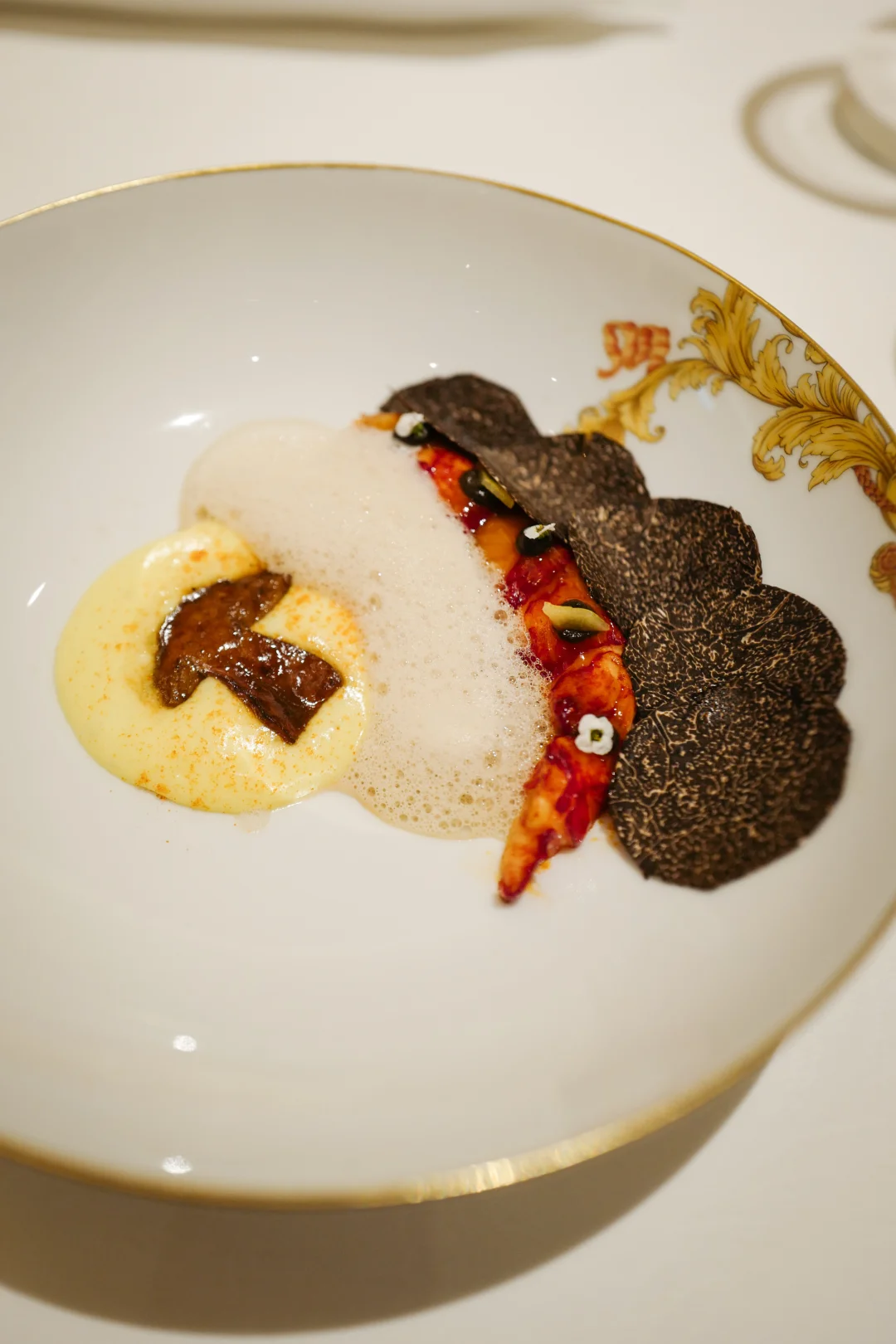 黑松露鱿鱼面配番茄清汤,再加上酸豆叶,很适合夏天。蓝龙虾的火候处理非常好,龙虾汤熬的很浓。西西里红虾陈皮意大利面,延续上一道的浓郁虾味,加上陈皮颗粒,层次丰富了许多。