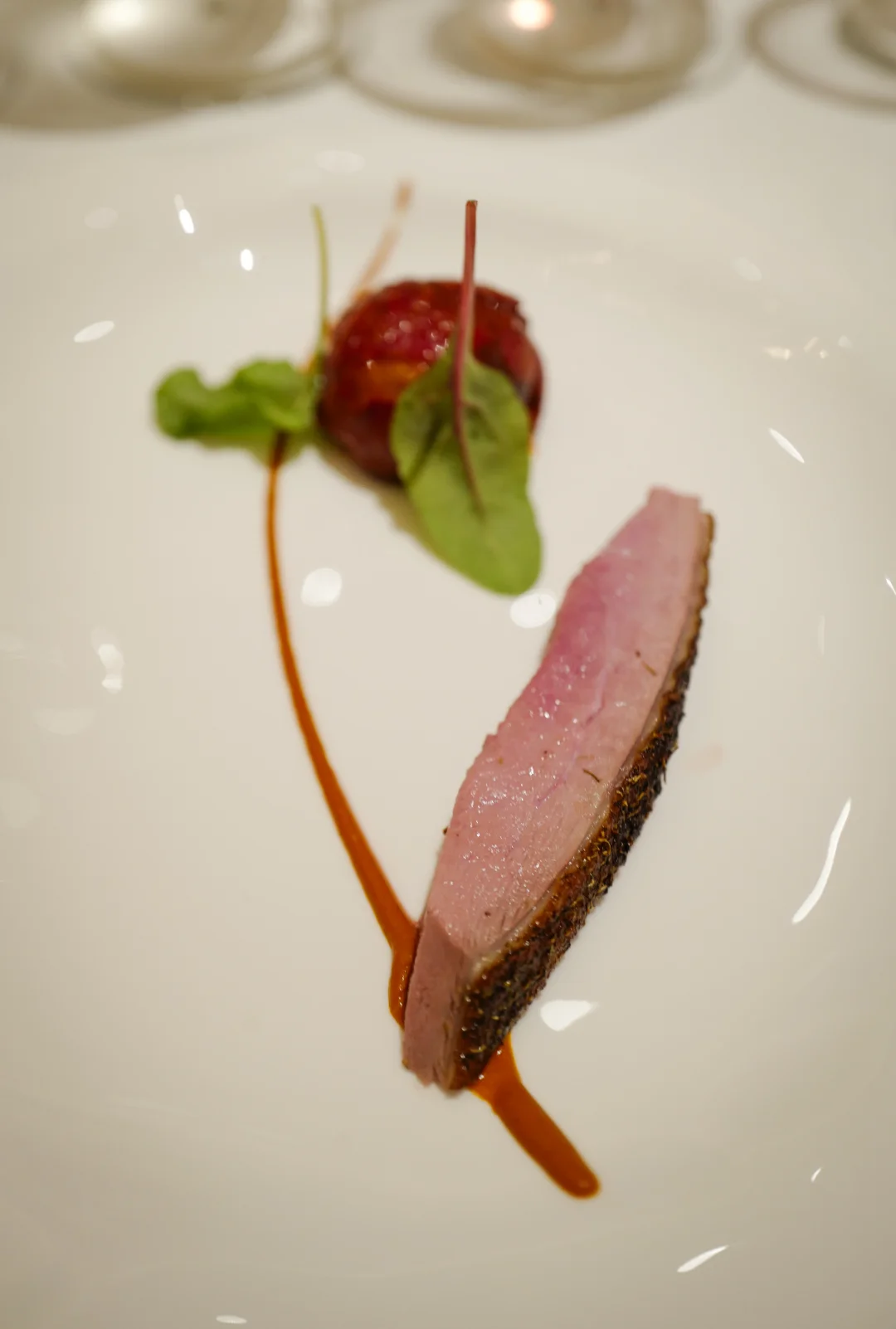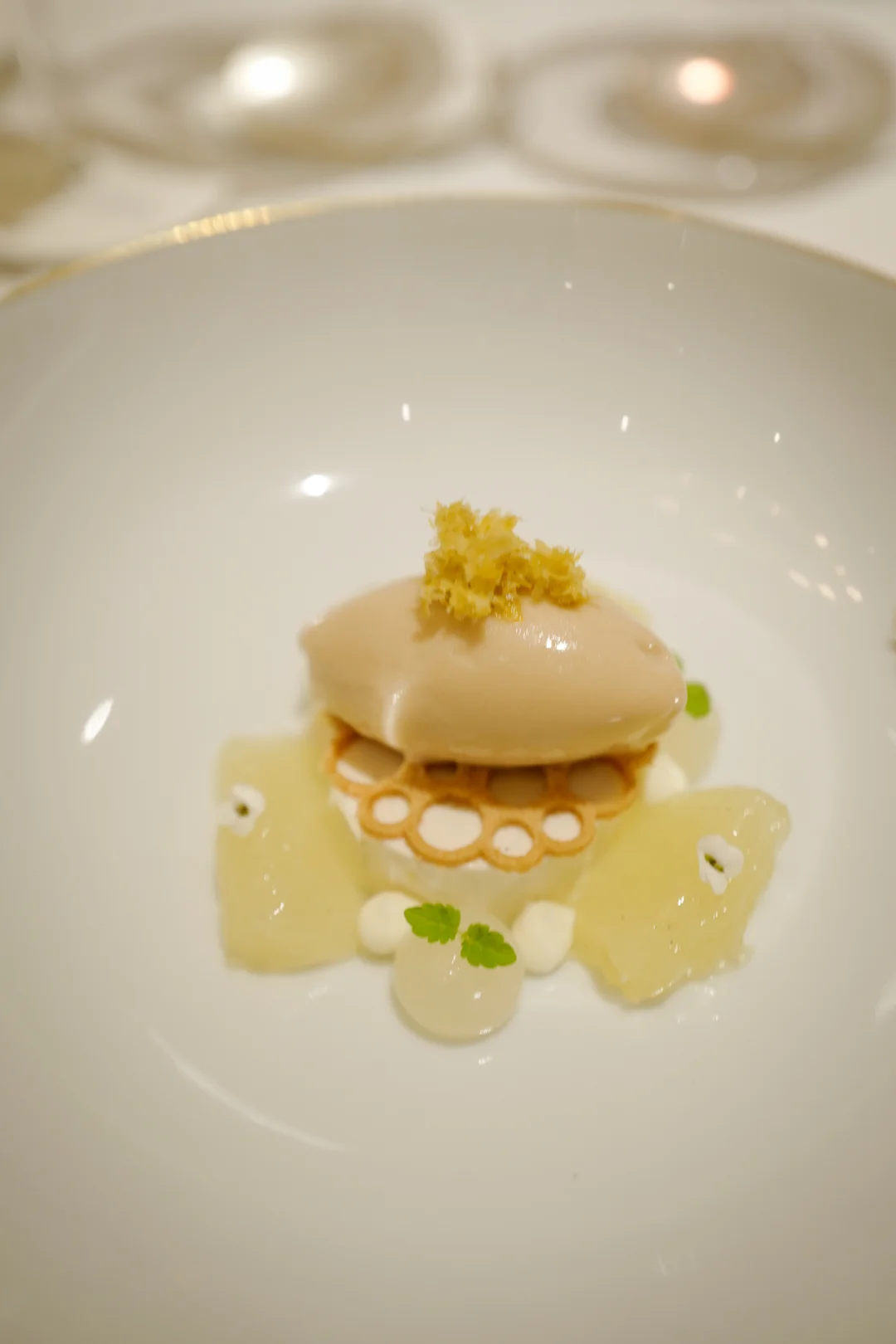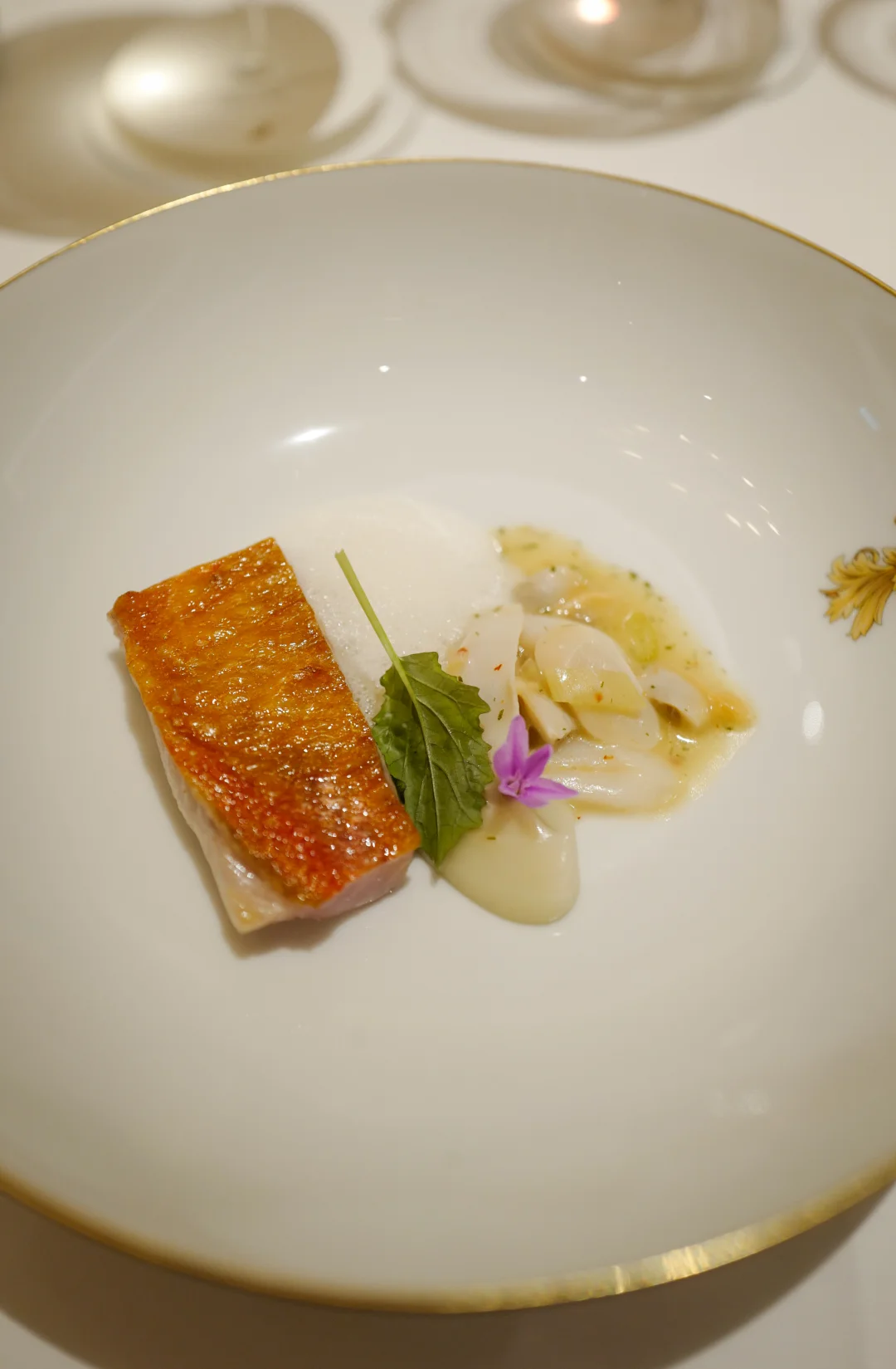 金目雕鱼皮微脆鱼肉鲜嫩,搭配的贝壳酱汁很有我在意大利吃的贝壳鱼汤的感觉,我很喜欢。这场四手的配酒也很清新,偏夏天的感觉。