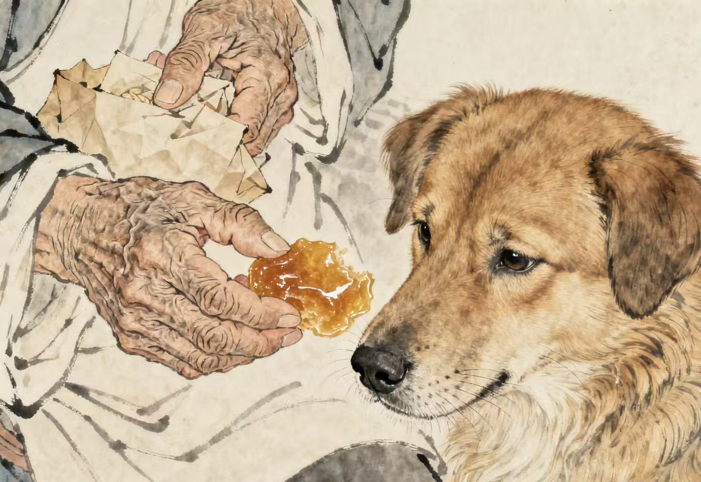 “是我错怪你了,好孩子。” 老栓的声音哽咽着,从怀里掏出油纸包,把麦芽糖掰了一大块,递到老黄狗嘴边。平时从不挑食的老黄狗,却只是闻了闻,没吃,只是用头蹭了蹭他的手。