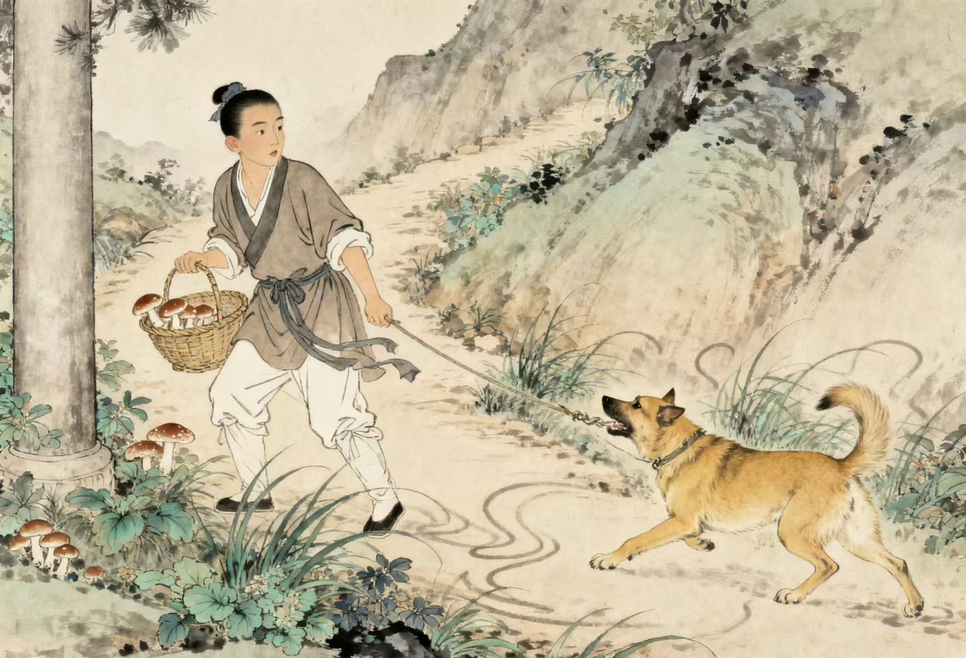 有一回,柱子要去山里采野蘑菇,老黄狗跟着去了。走到一片草丛边,老黄狗突然拽着柱子的衣角往后拉,柱子觉得奇怪,没往前走。没过多久,就看见一条毒蛇从草丛里爬了出来,吓得他浑身冒冷汗。回来跟老栓一说,父子俩更是感慨,这狗不仅救过老栓的命,连柱子也护着。