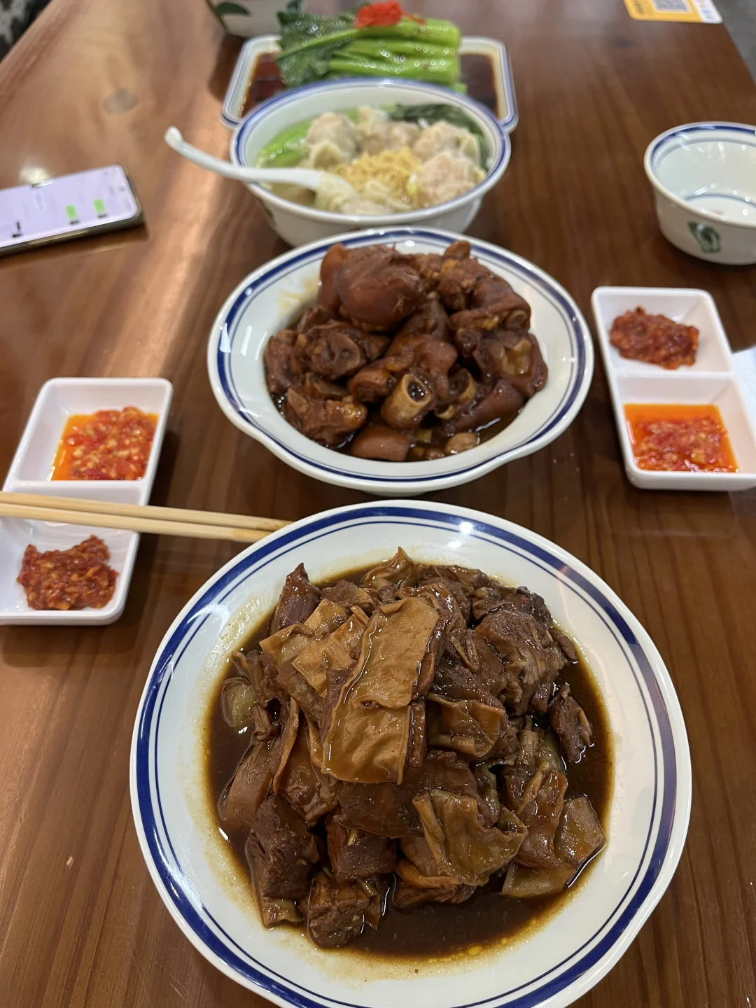 相对于云吞与竹升面联袂呈现,我更喜欢用猪手酱汁拌面的吃法,像客家腌面,又像北方人常吃的打卤面。青菜当然少不了,一碟芥兰足矣。