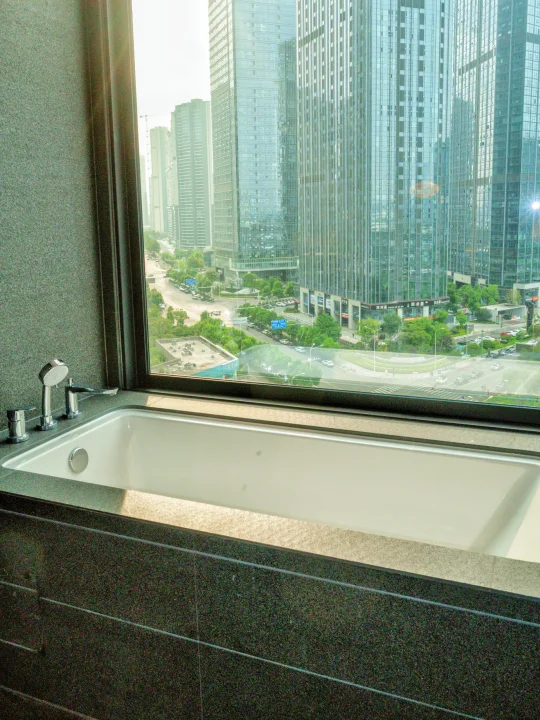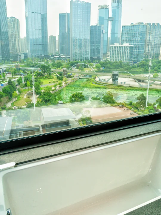 我们订的房间超大落地窗正对着梅溪湖,白天看波光粼粼的湖面,有一片荷塘,还能看到梅溪湖城市岛,视野开阔到让人想在窗边发呆一下午~房间里的设施也很贴心,智能马桶、独立浴缸、戴森吹风机全配齐,床品软乎乎的,晚上睡得超香!