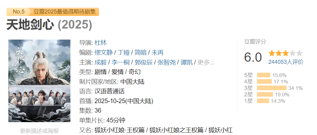 《天地剑心》的豆瓣评分曾经呈现断崖式下跌,从开分的8.9分一路暴跌,不过现在已经是趋于稳定6.0分,大IP成了勉强及格的模样,不管是权威媒体还是网友们的评价也从最初的盛赞转向沉默。
