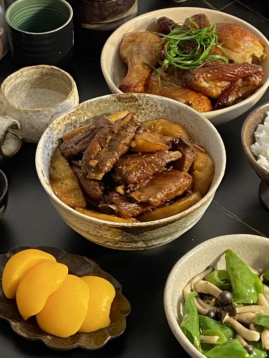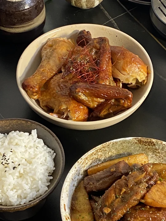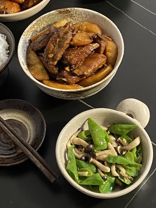 今日菜谱📜苹果炖小排 青椒蟹味菇 烤鸡🥢
