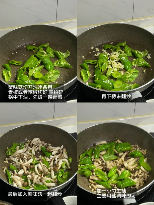 2)锅中下油,先煸一遍青椒,再下蒜末翻炒,最后加入蟹味菇一起翻炒,加一小勺生抽,主要用盐调味即可