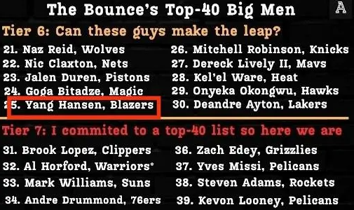 TA记者Zach Harper排NBA排名前40的大个子。其中约基奇独一档排第一,文班恩比德浓眉前四。另外杨瀚森排在第25,高于艾顿和萨尔等人