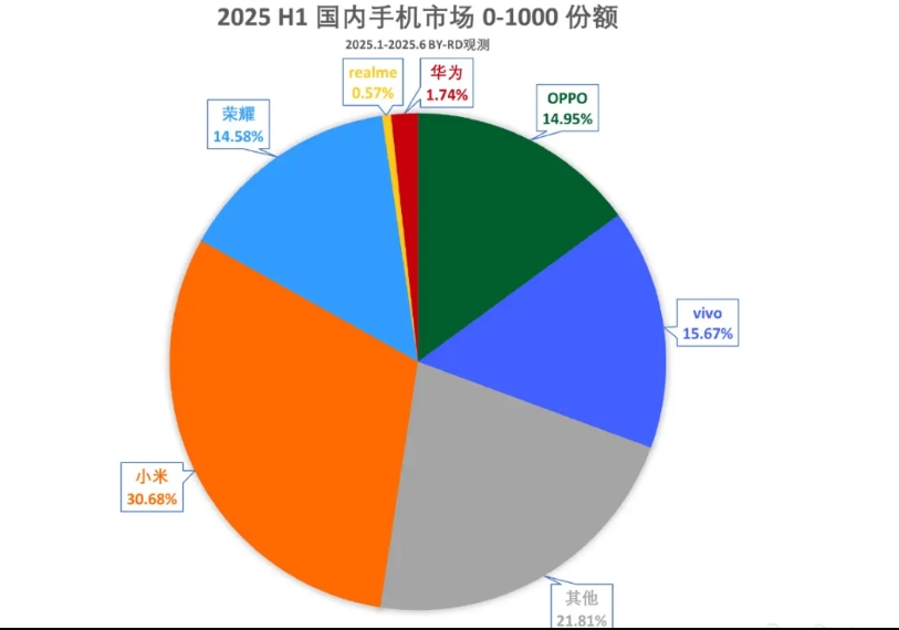 千元机市场是杂牌手机最好赚钱的领域! 近日,公布了上半年国内手机市场千元以下份额情况,可以看出小米确实是性价比手机的鼻祖,千元机销量也是遥遥领先的,而比较突出的是,除了小米、vivo、OPPO、荣耀、华为、realme手机,其它品牌依然占据了21.81%的份额,不得不说,千元机市场是杂牌手机唯一可以赚钱的领域!
