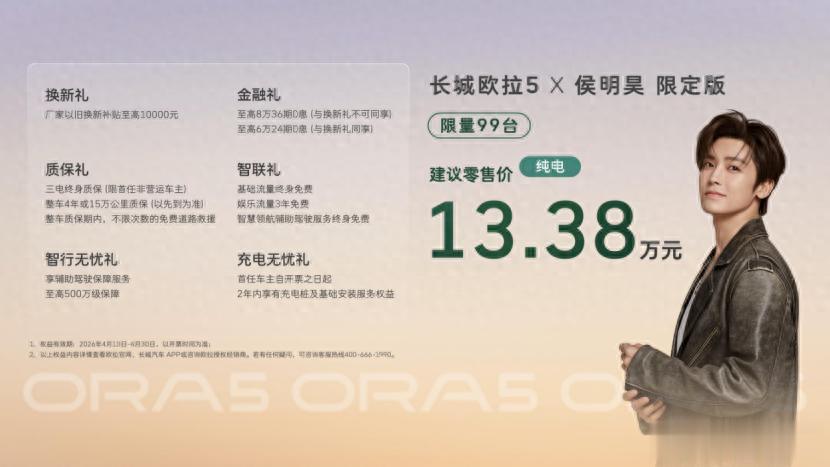 4月13日,由长城欧拉携手品牌代言人侯明昊及其粉丝团队打造的共创产品——长城欧拉5限定版纯电版(以下简称“欧拉5限定版”)正式上市,建议零售价13.38万元,欧拉5限定版售价与长城欧拉5 580km激光雷达版一致,新增敦煌绿车漆、专属尾标、中央扶手箱刺绣等多项专属配置,并可享“换新礼”、“金融礼”等多重限时好礼,加量不加价。活动当日,侯明昊现身保定爱情广场,把精心挑选的专属礼物交到首批用户手中,并亲密互动。现场气氛高涨且热烈,不少粉丝朋友甚至不远千里从外地赶到发布会现场为侯明昊打call,并一睹新车的风采。