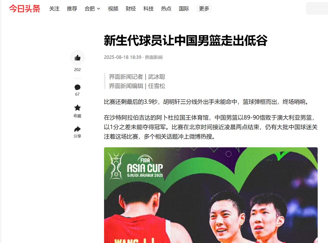 平常喜欢看一些比较高质量的文章,今日头条的头条深一度频道满足了我的愿望。没事的时候总会刷一下,尤其是今天看到了这篇《新生代球员让中国男篮走出低谷》。 文章从中国男篮亚洲杯出征前不被看好的质疑,到凭借球队每个队员的努力获得称赞,打出了空前的精神面貌,让我真正看到了中国男篮走出低谷,重新崛起的希望。 头条能有这样优秀的文章给我们篮球迷看,让大家感同身受,平台真的用心在做内容。 其实亚洲杯开打之前,中国男篮一直是不被看好的。多位主力队员缺席,甚至有人觉得小组赛都难以过关。 然而就是这样一支不被看好的队伍,一直到决赛以1分惜败澳大利亚获得亚军,中国男篮的队员们拼到了最后一刻,中国男篮的崛起不再是纸上谈兵。 这篇头条深一度的内容,摆出了中国男篮打得好的事实依据,以及未来的发展。希望未来能多看到这样的内容,能让更多人喜欢中国男篮。