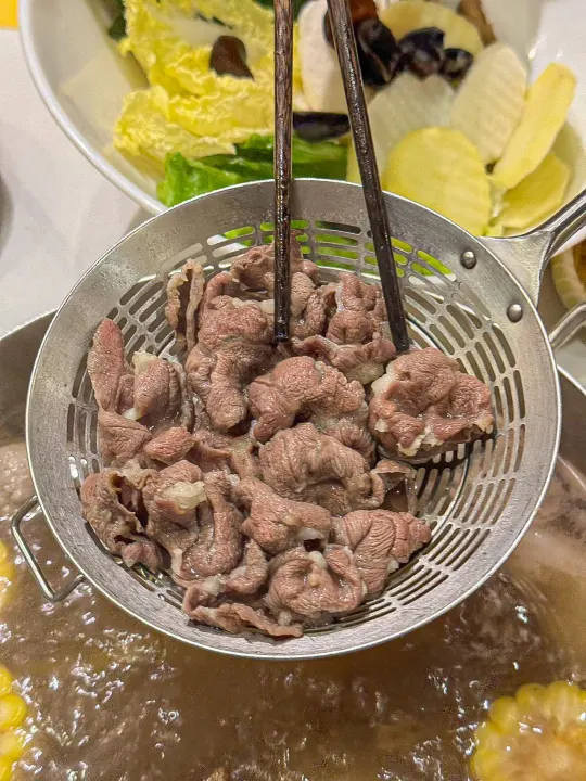👉匙皮:肥瘦相间,烫8秒就卷边,入口嫩到弹牙,蘸沙茶酱直接封神!