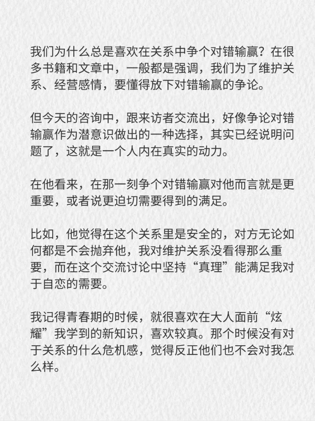 我们为什么总是喜欢在关系中争个对错输赢?在很多书籍和文章中,一般都是强调,我们为了维护关系、经营感情,要懂得放下对错输赢的争论。