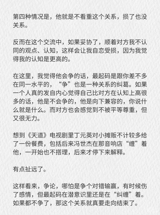 在这里,我觉得他会争的话,最起码是跟你差不多在同一水平的,“争”也是一种关系的纠葛。如果一个人真的发自内心觉得自己比对方在认知上高很多的话,他是不会争的,他是向下兼容的,你说什么就是什么。而对方也会感觉到不被平等尊重,但又很无力。