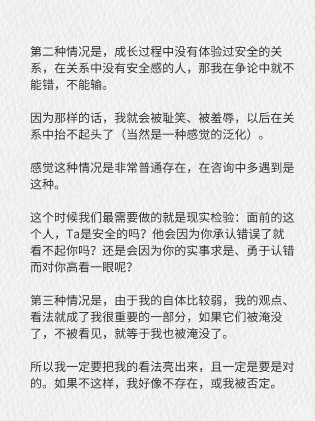 第二种情况是,成长过程中没有体验过安全的关系,在关系中没有安全感的人,那我在争论中就不能错,不能输。因为那样的话,我就会被耻笑、被羞辱,以后在关系中抬不起头了(当然是一种感觉的泛化)。