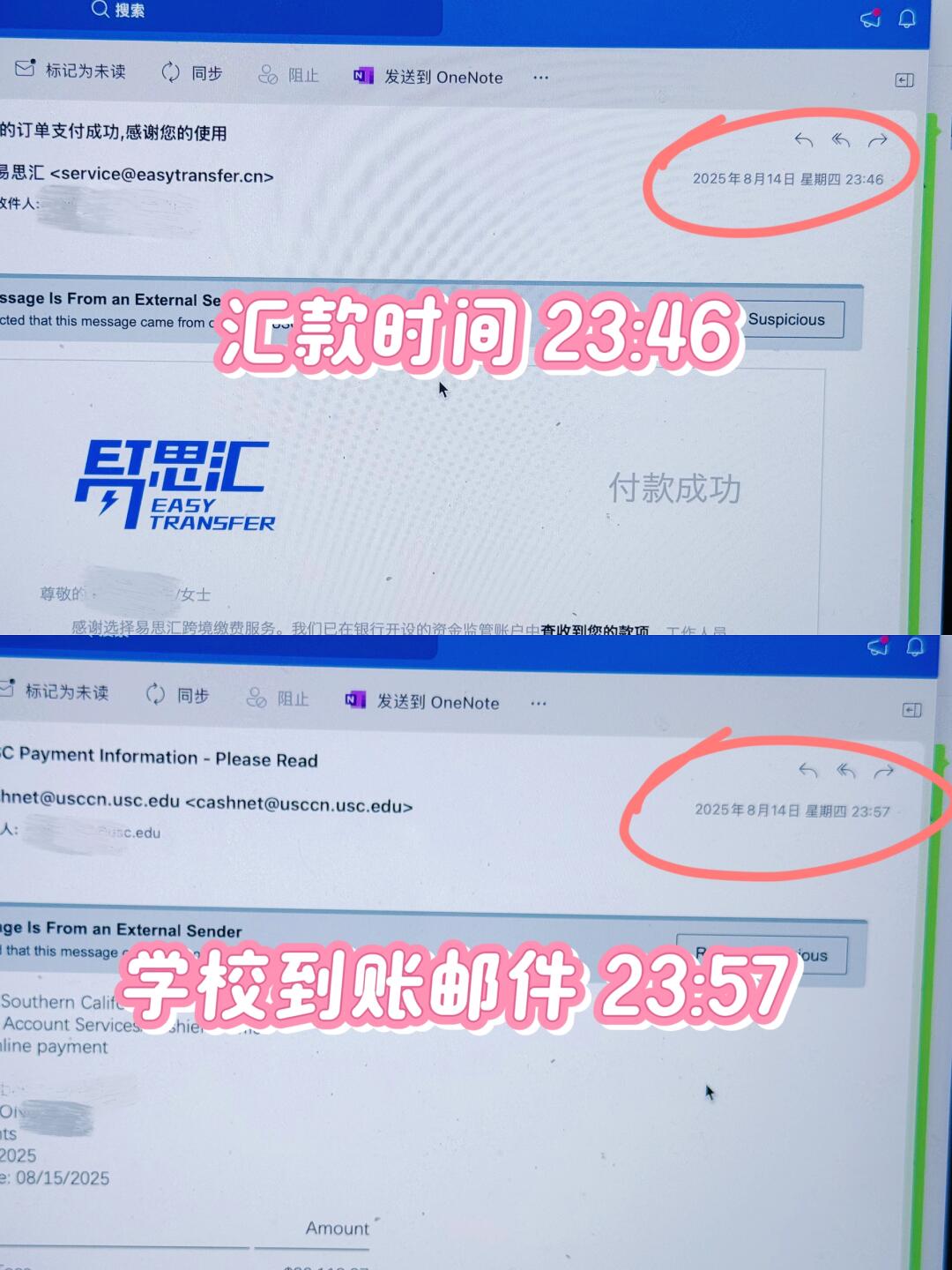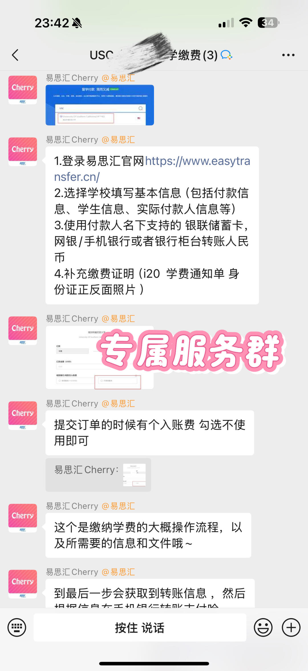 8月初选完课收到学费账单,每天看着汇率波动心情七上八下,幸好一直在红书上做攻略,也听了学长学姐安利,最后在好几个纠结里选了易思汇。 为啥不走官网,因为学费太大额,平时几百刀的消费无所谓,大几万🔪的汇率差真的难以言喻,差额即便只有0.05也是3-4k刀…可以买一只小香了 这次缴费还有客服小姐姐全程陪我超nice,一对一指导操作,从填信息到确认全程盯!完全不怕手滑+马虎转错,导致大额损失。 另外就是所有家长同学最担心的,费用安全和速度问题!别担心我试过了,到账超快!!到学校就花了12分钟,不用提心吊胆等3天怕被退回了!! 还有!usc同学付学费都可以免手续费!! 除了学费以外,付房租免除手续费,付全年房租免除手续费+足额,能节省好几k!!汇生活费到个人美国本地银行卡上也免除足额+手续费,也能节省好几百!! 周末汇率高的时候可以跟经理沟通先锁现在汇率,工作日汇率降了再缴费退差额,真的很人性化!!!