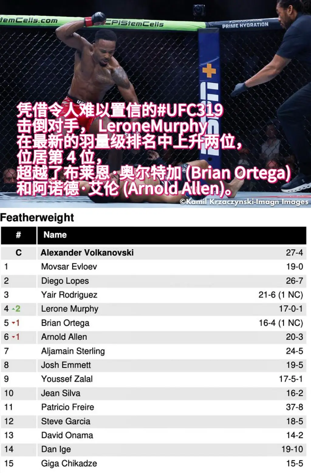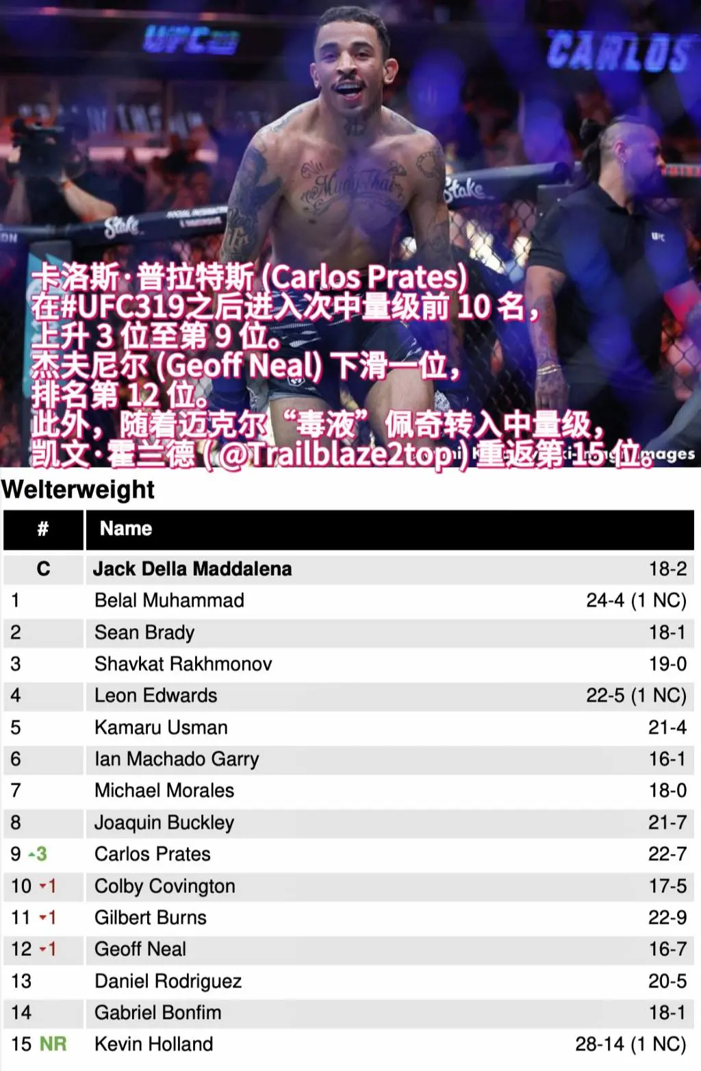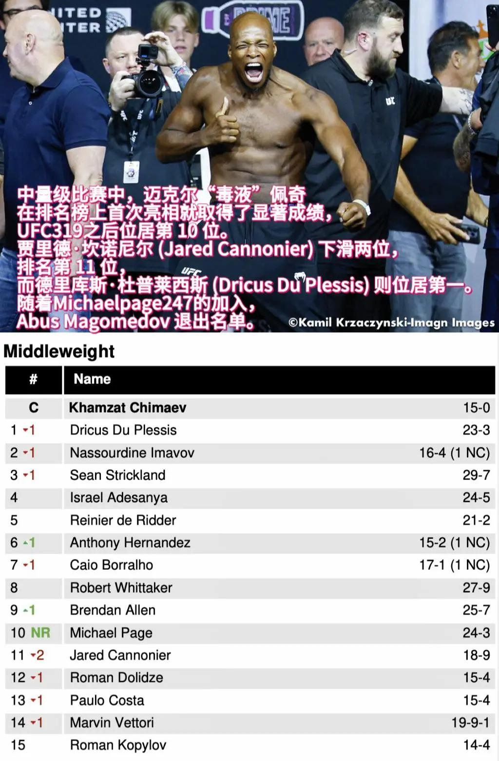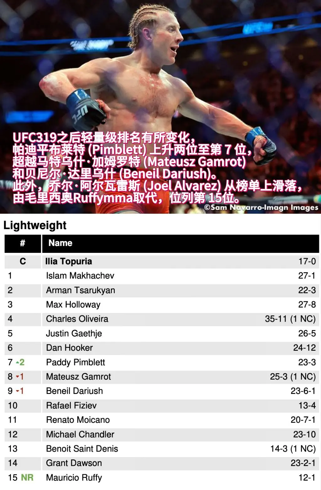 UFC最新排名。后最新排名更新!