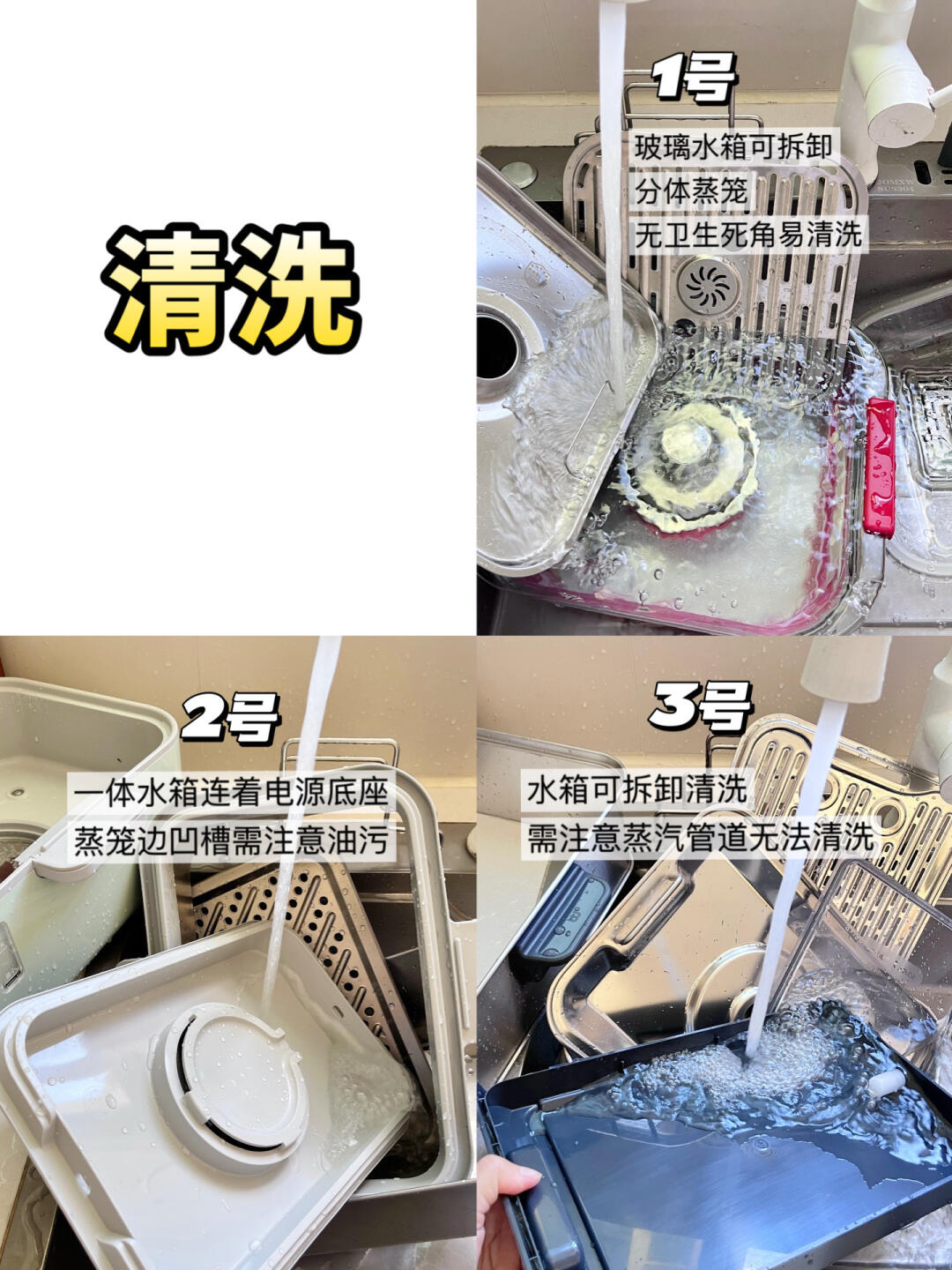 好不好清洗,一看平整度,衔接处缝隙少的更好清洗;二看水箱、蒸架等配件是否可拆卸,可拆卸的清洗起来更方便!三看材质是否可以放入洗碗机!