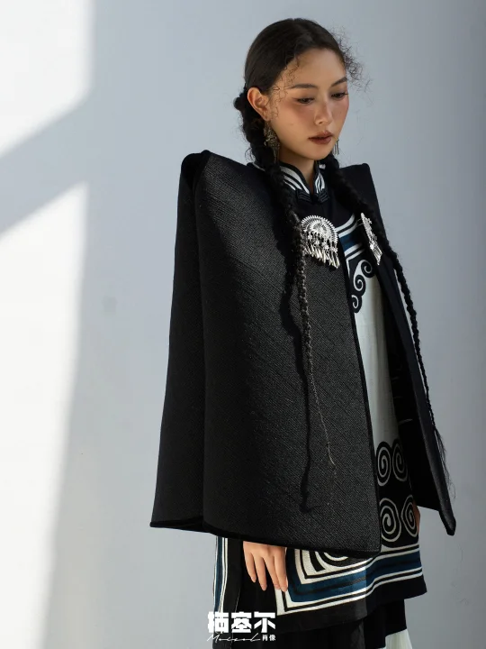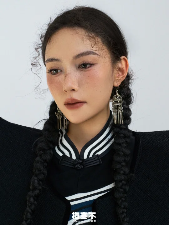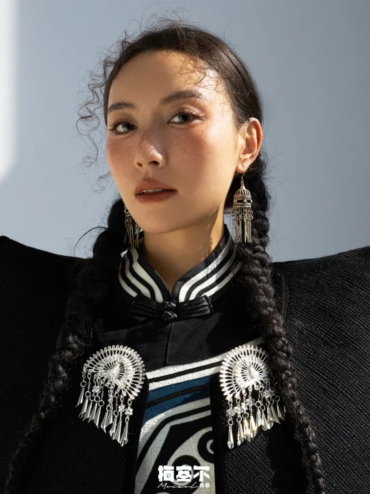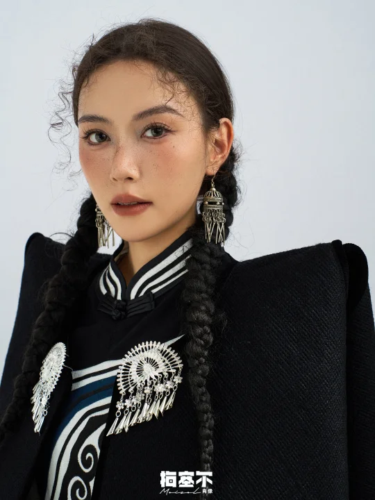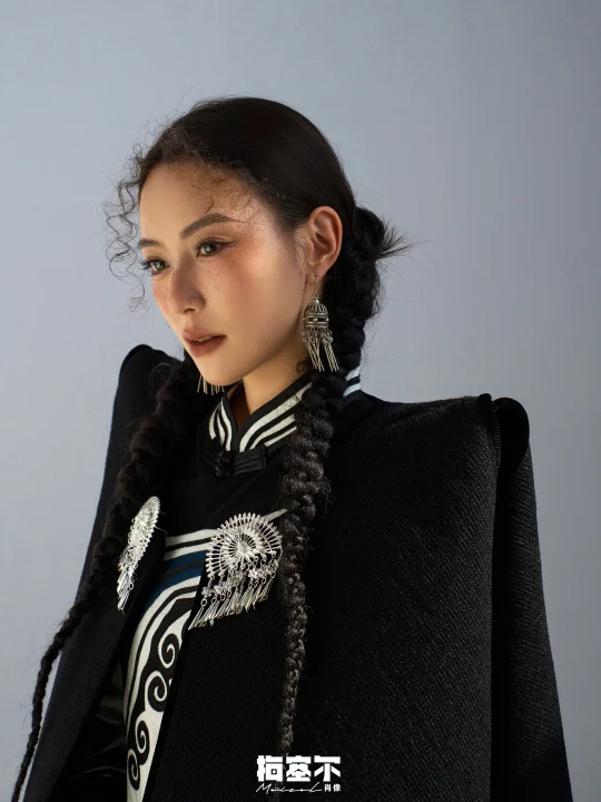 服饰上黑色的宽肩披风,是彝族「察尔瓦」的现代改良版。传统察尔瓦是彝族标志性的羊毛披毡,造型宽大、无袖,用来抵御山区的风寒,也象征着彝族对自然的适应与融合。 发型上我们采用都都是彝族女性传统发型——双麻花辫,象征青春与传承。我们保留了「长、粗、自然垂坠」的特征,让辫子“裸露”,强化民族辨识度,形成奇妙的冲突美感。