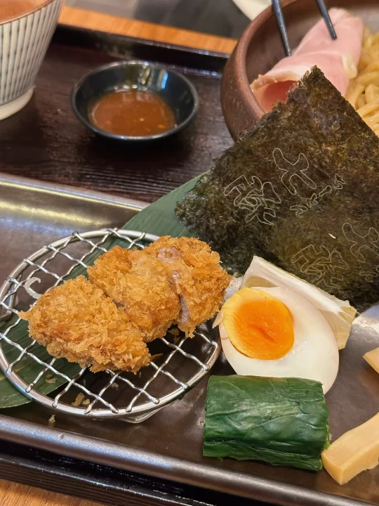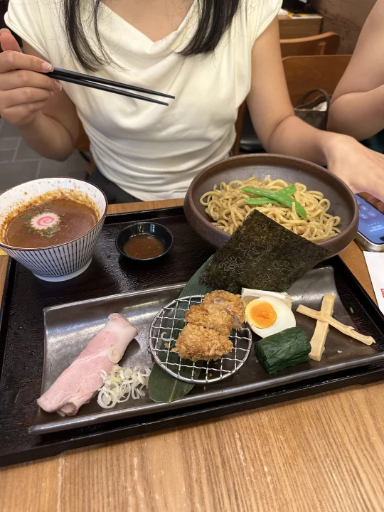 🍜 猪鸡汤味增蘸面:挚爱粗面太绝了!筋道弹牙还超挂汁,裹满浓醇豚骨蘸汁时,咸香直冲天灵盖!每根面都吸满酱汁,还有搭配的炸鸡~