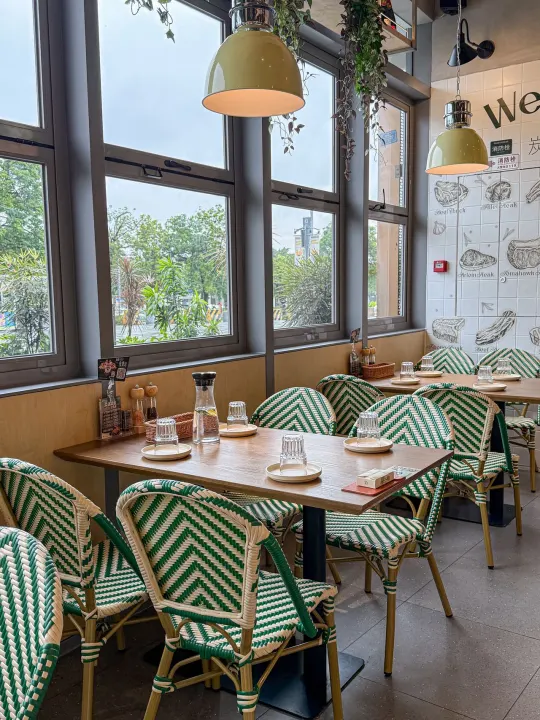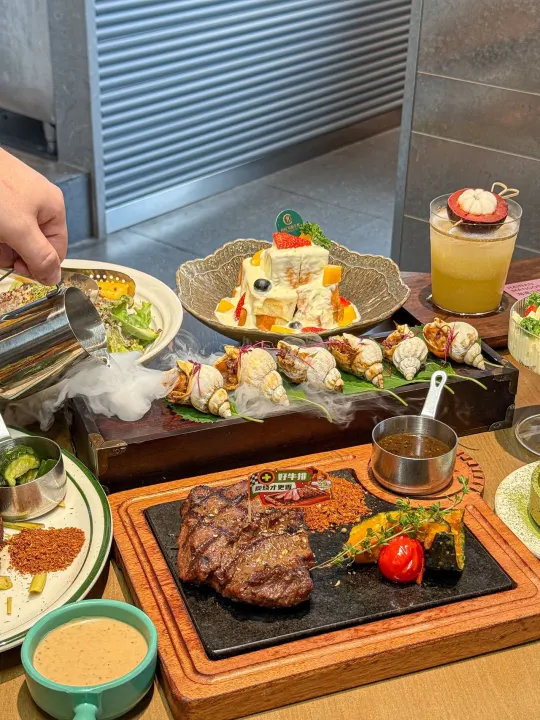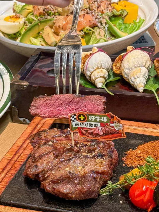 店里真的好漂亮!临街大窗景+绿植卡座 有种在画里用餐的感觉 直接美哭了!简直就是我的梦中情店😭 氛围真的很好,真的好适合约会啊!!而且菜都好好吃!! 牛排纹理非常漂亮!!个人推荐五分熟或七分熟!! 完全对胃!厚牛排,中间红嫩嫩,咬一口汁水丰盈!! 好看又好吃的漂亮饭!!