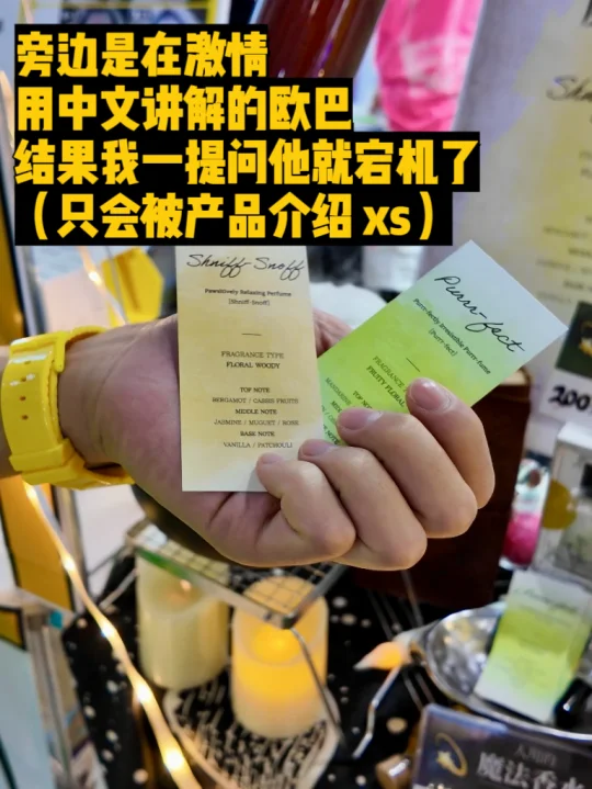 反倒是韩国展团东西比较多样化,一个可爱的欧巴卖宠物香水,让我闻两张纸片,说我“小狗型人格”,因为这个香水的成分用的是小狗喜欢的味道。另一种是猫咪喜欢的香味,有猫薄荷精华。我追问成分,他大脑宕机了,跟我坦白他只会背产品介绍。结账时他的老板把香水放平底锅里各种“炒”,还要吹两口气才给我,情绪价值满满,笑死我了。🤣