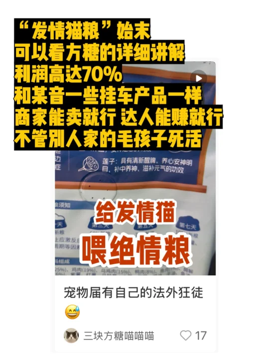 不过有一说一,抑制猫发情的需求确实很大。很多小地方的人不舍得或没条件给猫做绝育,猫发情只能任由它承受这种无法控制的痛苦,生出来的小猫也没人管,大多是悲剧结局。某多上有很多同类产品,大概率有风险,可能对猫有害。