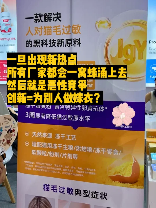 自从冠能发布了抗过敏猫粮,一夜之间各种仿制品全出来了,现在连工厂都直接在卖抗过敏蛋黄冻干粉,要做零食、做片剂、压到猫粮里都可以,但效果怎样就不知道。