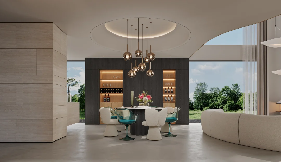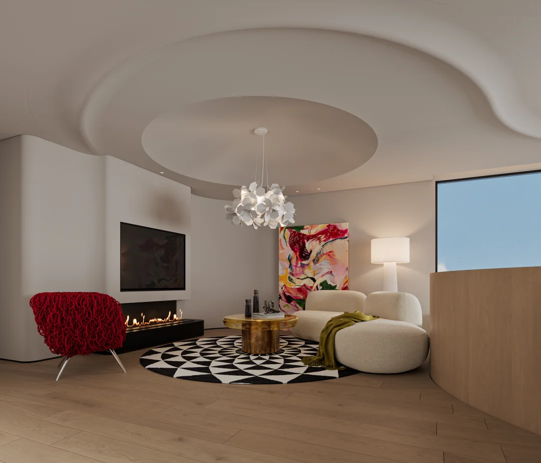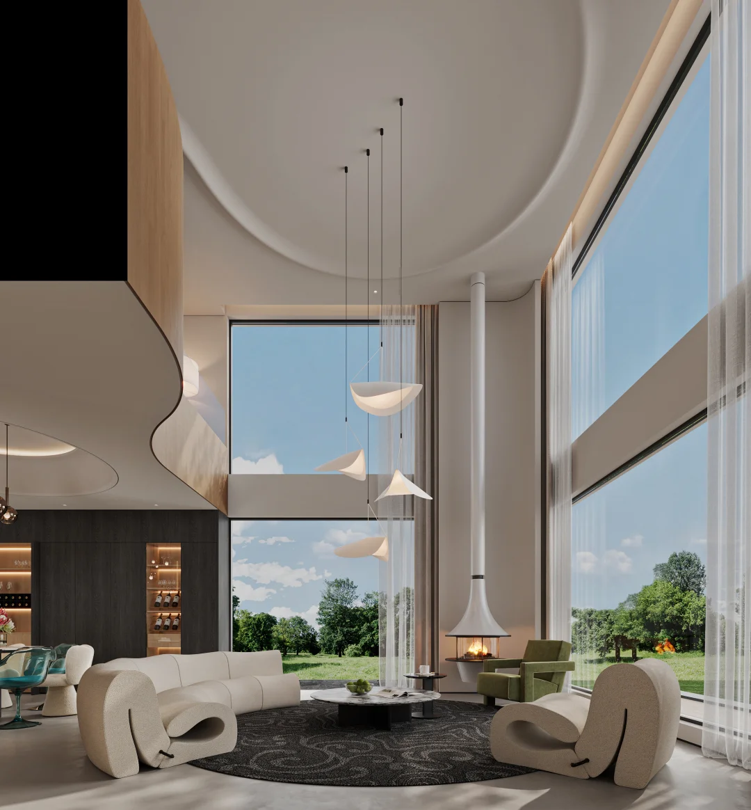 悬浮火焰壁炉+360°花园视野!这才是梦想中的家! ✨「落地窗守候四季花园 悬浮壁炉燃起冬日浪漫 客餐厨一体实现陪伴式育儿 不要电视墙!挑空层高让笑声翻倍回荡」