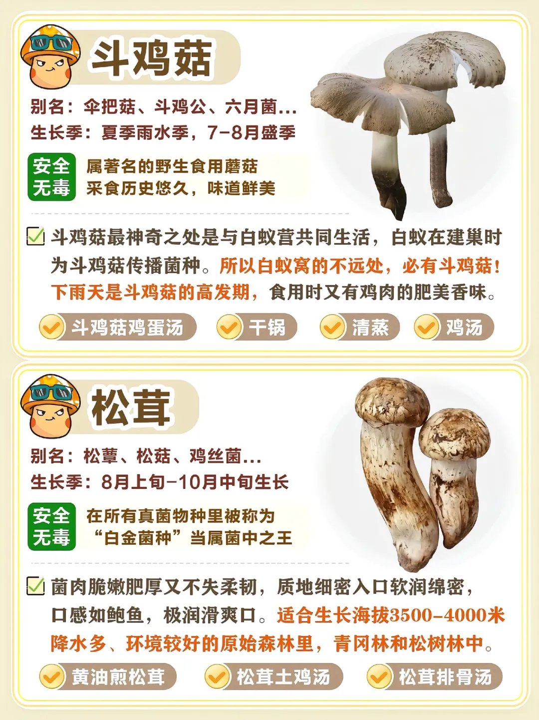 ✅斗鸡菇:夏季雨水季7 - 8月盛出,和白蚁共生,下雨高发!口感有鸡肉肥美香,能做鸡蛋汤、干锅,鲜掉眉毛~