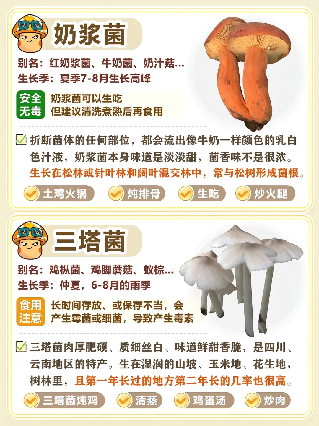 ✅奶浆菌:夏季7 - 8月高峰,折断流乳白色汁液,淡淡甜味超特别~能生吃(但建议煮熟),土鸡火锅、炖排骨巨鲜!